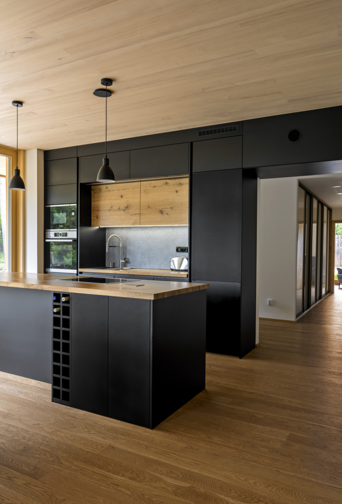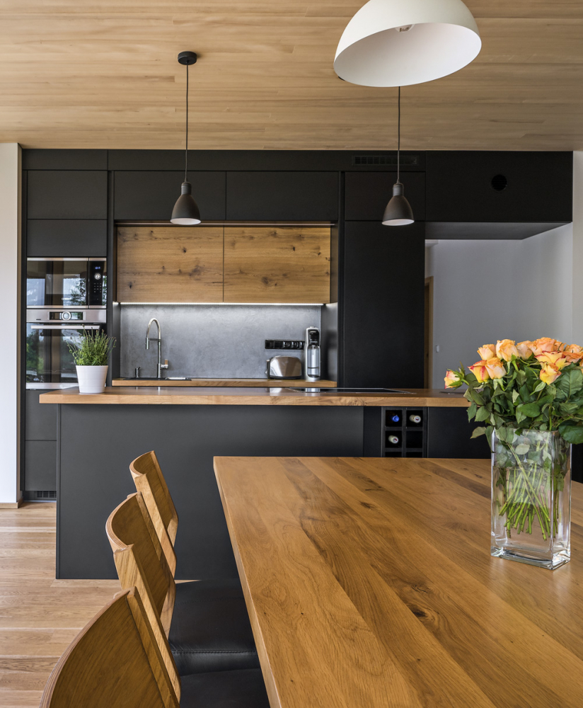 Černou sestavu opticky odlehčuje dřevěná pracovní deska a dvě horní skříňky v dubové dýze. Na hlavní lince je umístěný dřez s pracovní plochou, součástí je i vysoká spížní skříň, vestavěná chladnička a trouby. Příjemným prvkem kuchyně je ostrůvek, na kterém je umístěná varná deska. Kromě přední strany poskytuje úložné skříňky i v rozšířené části směrem k jídelnímu stolu, kde je také police na ukládání lahví. K sestavě se dobře hodí masivní dubový stůl.