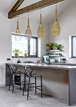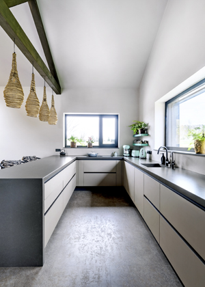 Obyvatelé domu jsou mladí, velmi aktivní a vytížení. Jak ale přiznávají, v kuchyni tráví hodně času a rádi vaří, proto jí věnovaly v rámci dispozic interiéru náležitý prostor. Kuchyň je součástí velkého obývacího pokoje spojeného s jídelní, společenskou a relaxační zónou, který lehce cituje prvky etno stylu. Protože se v interiéru výrazně uplatňuje dřevo v rustikální podobě, barevný sedací nábytek, výrazná svítidla a doplňky, zvolila majitelka pro kuchyň rozvrženou ve tvaru písmene „U“ střízlivý, minimalistický design, který lze snadno oživit a obměňovat doplňky.