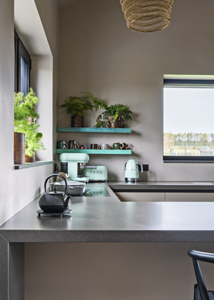 I s ohledem na čtyřnohé miláčky padla volba na kuchyňský nábytek Arredo3 Kali-Retta, který je zhotoven z materiálu Fenix vyrobeného nano technologií. Tento materiál vyniká příjemným matným povrchem, který je zároveň odolný proti mechanickému poškrábání i ulpívání otisků. Dominantní kávový odstín Castoro Ottawa doplňují integrovaná madla v celé délce pracovní desky a sokly z hliníku v barevném provedení Titanio, které jsou díky tomu recyklovatelné, a tím šetrné k životnímu prostředí. Výslednou kompozici uzavírá šest centimetrů silná pracovní deska z umělého kamene Silestone, u níž si Dominika pochvaluje extrémní odolnost a pohodlnou údržbu. Deska volně přechází v dřez z téhož materiálu, který doplňuje baterie a pítko filtrované vody v jednotném černém designu. Protože z kuchyně nebylo možné vyvést klasickou digestoř, je pracovní deska osazena indukční deskou s integrovaným odsavačem Bora.