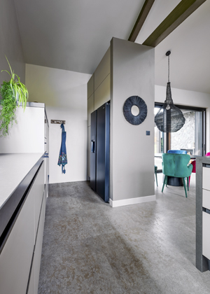 Vzhledem ke specifickým potřebám domácnosti se třemi psy stojí za pozornost vnitřní uspořádání kuchyně, které bylo částečně využito i jako spíž na psí krmivo. Skříňky jsou vybavené programem Blum Legrabox, který umožňuje navrhovat podobu zásuvek naprosto individuálně. Dodejme, že zásuvky Legrabox jsou vyrobeny z kovu a vynikají vysokou nosností a možností plného vysunutí, což je (nejen) pro potřebu ukládání zásob granulí a konzerv extrémně pohodlné řešení. Psi mají v zadní, skryté části kuchyni také svůj „servírovací“ prostor, kde jsou jim k dispozici misky s vodou a s krmením. Podkladová plocha je v tomto místě tvořena uzavřeným hliníkovým podkladem sladěným s materiálem soklů, aby nedošlo k poškození kuchyně vodou z misek.