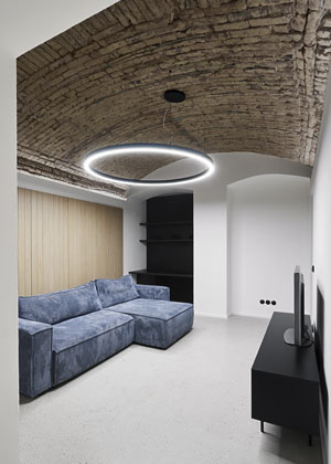 Investor oslovil ateliér ti architekti s tím, že chce propojit dva vlhké sklepní prostory s bytem v patře skrze klenbu. Zásadní částí rekonstrukce proto byly stavební úpravy, které vedly k vytvoření zcela nové dispozice: „Ve sklepních prostorech bytu jsou větrané podlahy (igloo), statickým oříškem byly zásahy do nosné části domu a zkrácení klenby, abychom mohli vytvořit schodiště mezi dvěma podlažími.