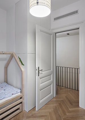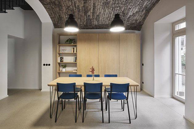 Vstup do bytu je z druhého nadzemního podlaží, kde se nacházejí dva pokoje, koupelna a technické zázemí bytu. Schodiště vede z klidové zóny do původních sklepních prostor, kde je vzdušná kuchyně s jídelnou propojená s vnitroblokem francouzskými okny.