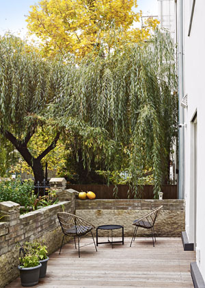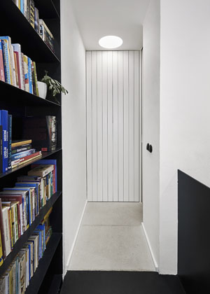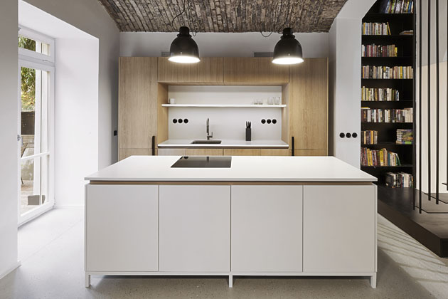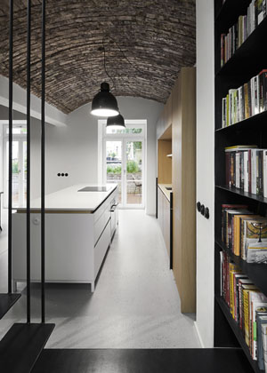Sklep byl se zahradou propojen novými otvory v obvodové zdi a venku jsme navrhli terasu. V bytě je podlahové vytápění a rekuperace a poměrně sofistikované rozvody elektřiny a slaboproudu,“ upřesňuje architekt Martin Machů a dodává, že nejvýraznějším materiálem v rámci interiéru je ocel – ocelové je schodiště, knihovna instalovaná na výšku obou pater a podesty.