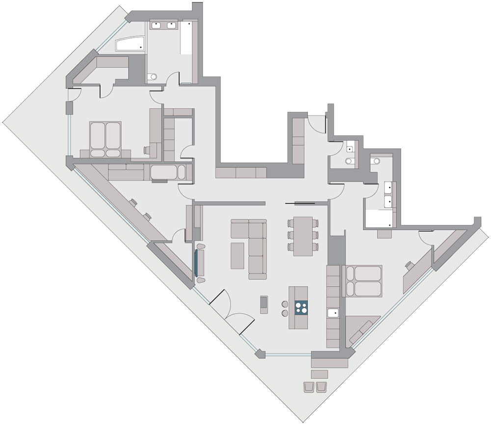 Byt v jedenáctém patře o rozloze 187 m2 zabírá polovinu podlaží jednoho z krajních domů. Stěžejním prvkem jeho dispozice je chodba vedoucí do všech místností. Hlavním požadavkem investora byl rozlehlý obývací prostor a jídelní stůl pro deset osob, bylo proto nutné posunout příčku dělící obývací pokoj od chodby, což si vyžádalo dílčí změny v umístění dveří do pokojů sousedících s chodbou.