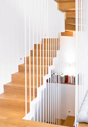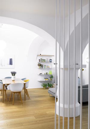 Společně sedíme u jídelního stolu na polstrovaných židlích značky HAY. Stůl zdobí malovaná váza Křehký s levandulemi a na zdi visí malba od Iry Svobodové. Čistě geometrický obraz se zlatými detaily ladí k éterické knihovně od francouzského architekta Jeana Nouvela. Její „levitující“ poličky zkrášluje neonově žlutá bandaska Dechem, difuzér Rückl a vázy od Jiřího Pelcla. Jemnost interiéru podtrhují oblé tvary světel, které jsou povětšinou z opálového skla. Do nového domova se zamilovala okamžitě a po první prohlídce prostor začala s vymýšlením návrhu a objížděním všech dodavatelů. Moderní interiér majitelka citlivě kombinuje s historickou hodnotou impozantních klenutých stropů, které zútulňují celé přízemí domu. V něm se nachází obývací pokoj, který volně přechází v jídelnu a kuchyni. Příjemně hřejivý a vlídný prvek v domě je dubová podlaha, hravost do interiéru zase vnáší schodiště, jehož zábradlí tvoří kovové bílé tyče prostupující všemi patry.