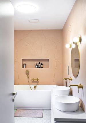 Hlavní prim v něm hrají zlaté doplňky a velmi jemný odstín teplé šedé, kterou je, jak se čtyřnásobná maminka nezdráhá přiznat, lehce posedlá. „Šedá v kombinaci s pastelovými barvami a dřevem na mě působí meditativně, a proto se opakuje různě na povrchu vestavného nábytku po celém domě a kuchyňské lince. Samozřejmě k ní musela ladit i americká lednice, což byl lehce oříšek, stejně jako spousta dalších maličkostí včetně baterií, dřezu, obkladů nebo svítidel, které mnohdy dodavatelé naskladnili po několika měsících. Nakonec, občas s vypětím sil, se vše povedlo,“ otevírá dnes už se smíchem naše povídání absolventka známé London College of Fashion Tereza Vu.