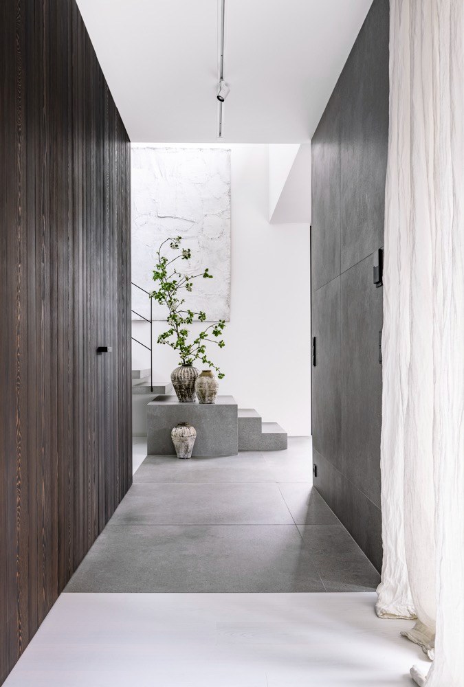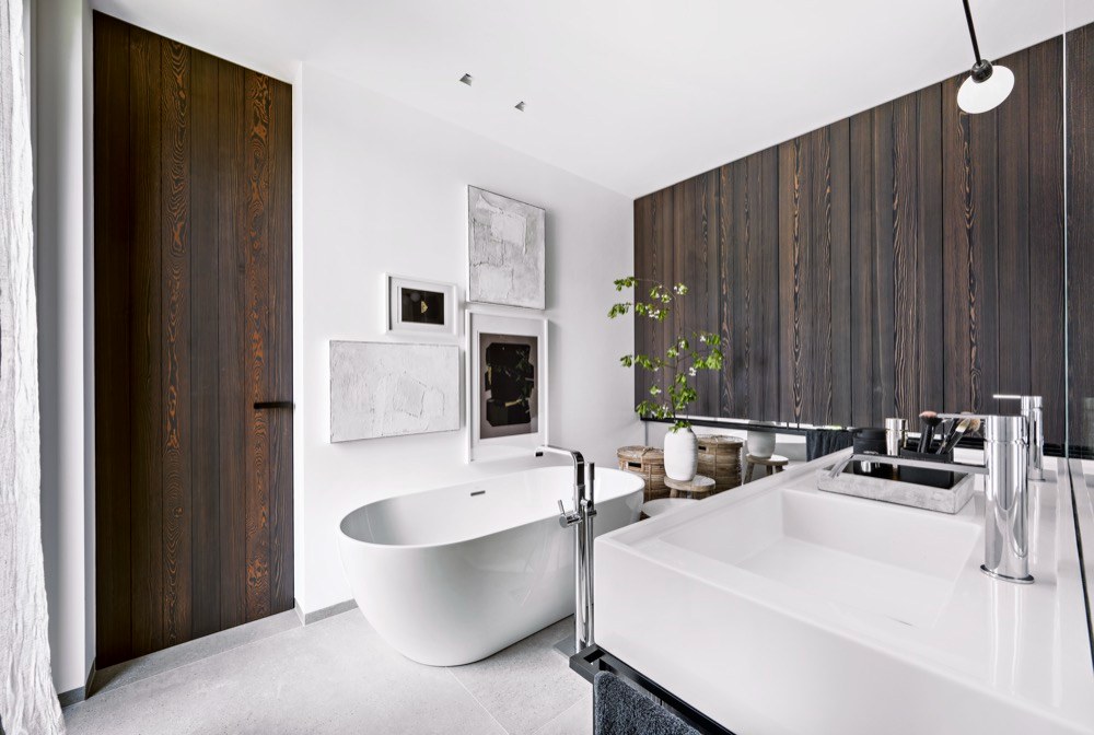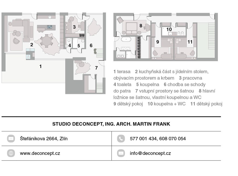 „Dřevěný obklad nebyl v mém podvědomí navržený náhodně na různých místech domu. Byly z něj vytvořeny kubické tvary shodné a ve stejné barevnosti, jakými disponuje sám dům. Exteriér se tvarově i barevně promítá do interiéru, ovšem záměrně v jiném materiálu, který si přináší z vnějšího prostředí kůry stromů. Kubické tvary modřínového obkladu jsou vloženy do bílé hmoty interiéru,“ komentuje své dílo architekt Martin Frank ze studia Deconcept, který vyladí vaše domovy až do úplného finále. Nabízí svým klientům celistvý koncept dotažený do posledního detailu včetně stylingu. Jde svou vlastní cestou a přináší vize odrážející mnoho vlivů z všedního života. Ve výsledku vám namíchá chutný koktejl stylového domova, který bude nadčasový, funkční, příjemně ležérní, uvolněný a pohodlný.