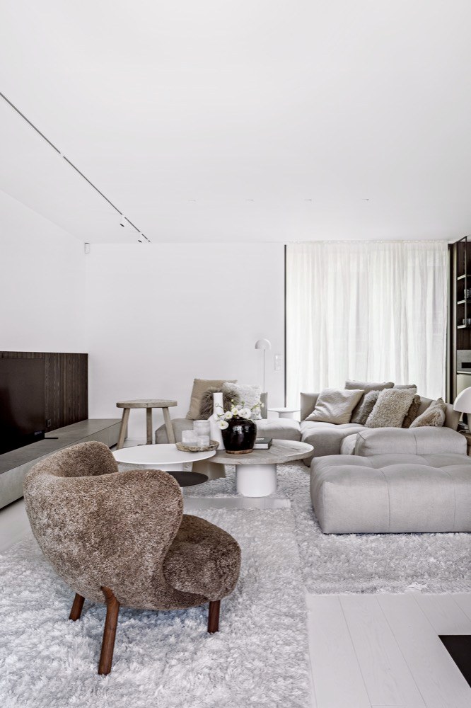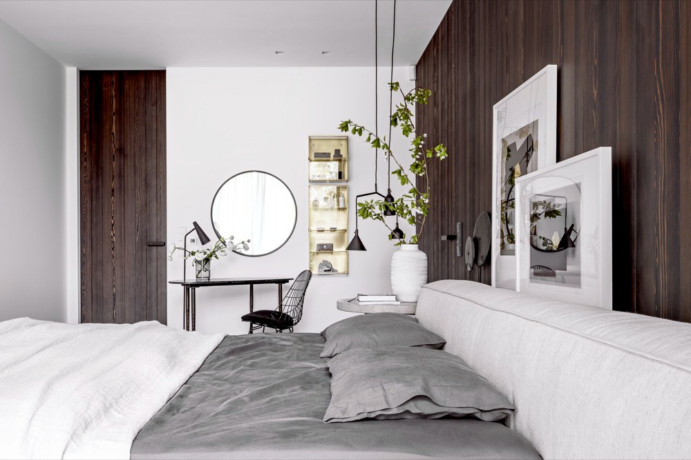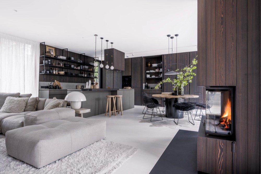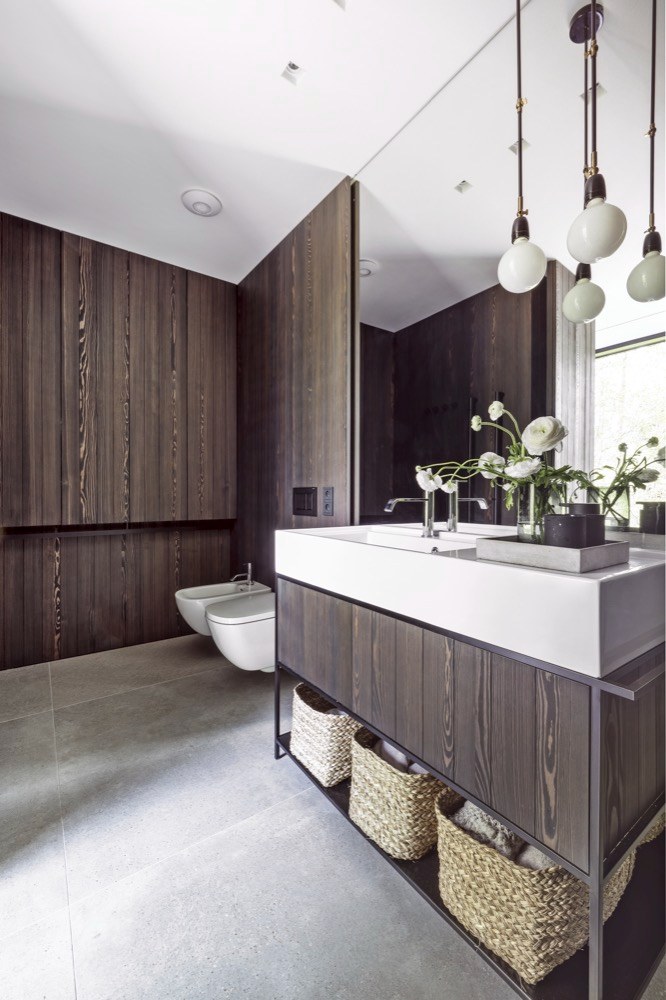 Právě stylově velmi uvolněné a přátelsky vyhlížející interiéry v precizním provedení přivedly manželský pár následně k architektu Martinu Frankovi, který atraktivní stavbu proměnil v hřejivý domov. Od počátku manželé viděli svůj dům více jako městský víkendový dům, který oblékl kabát ručně vyrobené pálené belgické cihly a šat čokoládově mořeného modřínového dřeva s odhalenými letokruhy odkazujícími na kůru zdejších borovic. Svoji mimořádnost vystavěl na dokonalé nedokonalosti. „Prostředí lesa volalo po stržení okázalosti, borovice jsou tu sochami, bylo žádoucí vnést barevnost cihel a kmenů stromů do interiéru. Modřínové dřevo svou nejednolitostí odstínů fantasticky navazuje na strukturu dřeva venku,“ vysvětluje Martin Frank. „Sám obdivuji belgickou a holandskou architekturu. Konkrétnější představa klienta mi konvenovala, byla pro mě obohacující. Nadchlo mě prostředí se svými stromy i jeho barevnost. Než jsme se ale dopracovali ke konkrétnímu odstínu modřínového dřeva, vyzkoušeli jsme mnoho vzorků. Samozřejmě že tmavý koncept interiéru s velkým přesahem stropů teras ovlivnil světelnou atmosféru uvnitř domu. Z toho mi vcelku logicky vyšla světlá podlaha, která odráží světlo do interiéru,“ doplňuje architekt. Přestože interiér disponuje notnou dávkou čokoládového odstínu, není tmavý. Výborně ho vyvažují bílá podlaha, bílá výmalba a světle šedé odstíny nejen betonu. Principem vytváření kubických tvarů a jejich prolínáním dosáhl architekt nadčasovosti a zklidnění. Podpořil tím čistotu interiéru, kdy je vše do těchto kostek skryté. V podstatě nevnímáte, že jde o nábytek. Na hladké čokoládové ploše postavil architekt efekt jednotlivých místností. Každá místnost je svébytná, má svoji osobitou atmosféru, vše je motivem dřeva rafinovaně propojeno. Interiér působí velmi vřele a útulně, je vskutku k žití! „Nepřišla jsem na nic, o čem bych si myslela, že jsme to měli udělat jinak. Vše funguje tak, jak má, dobře se nám tu žije, splnil se mi sen,“ vyjadřuje své nadšení majitelka. „Mě hodně baví průhledy v domě, tvoří úžasné obrazy, které se v průběhu roku mění s každým ročním obdobím,“ konstatuje s potěšením majitel.