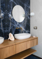 Koupelna je vybavena prvky od Rexa – závěsným umyvadlovým modulem Moode z drážkovaného dubu, zrcadlem Filolucido s podsvícením a umyvadly Conca. Kombinace přírodních materiálů a moderní technologie podtrhuje atmosféru vytříbené elegance.