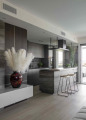 Kuchyně z kolekce N Elle značky Cesar je vybavena pracovní deskou a obkladem z porcelánové kameniny Inalco Geo Gris Abujardado, opracované pod úhlem 45° s minimální tloušťkou, což dodává celé kompozici lehkost a preciznost. Lakované kovové plochy v niklovém efektu se střídají s prvky z mořeného dubu, jako je snídaňový pult, a harmonicky ladí s parketami vybranými klientem. Stejný materiál se objevuje i na TV stěně, kde se organicky propojuje s boiserií.