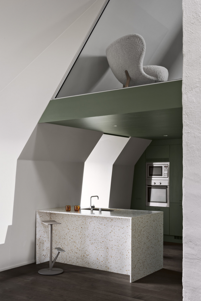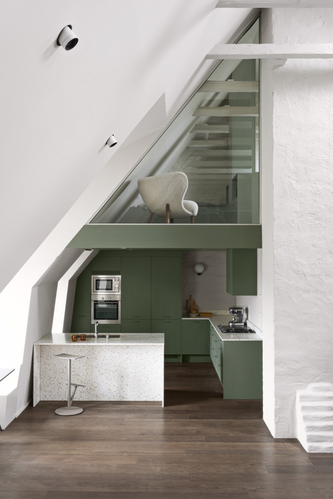 Kontrastní kombinace tmavě terakotové a tlumeně mentolové barvy, která je využitá nejen na nábytku, ale také na stavebních prvcích a schodišti, dodala interiéru svěží a zároveň domáckou atmosféru – vyrostla tak osobitá dominanta celého podkrovního bytu. Díky použití kvalitních materiálů, jako je kámen, masivní tónované dřevo a třeba i důkladně promyšlené detaily spojů či výběr decentních úchytek nábytku vznikl z interiéru půvabný, vzdušný a nadčasový domov.