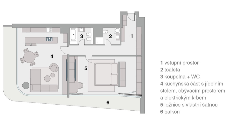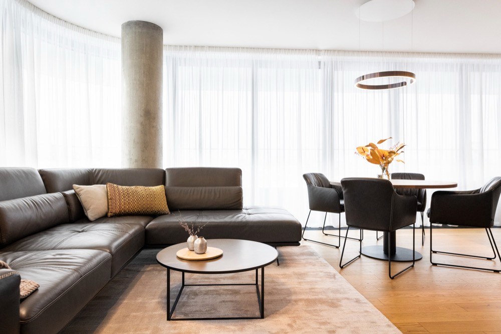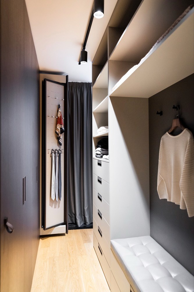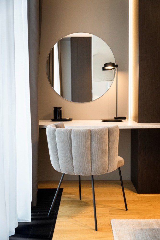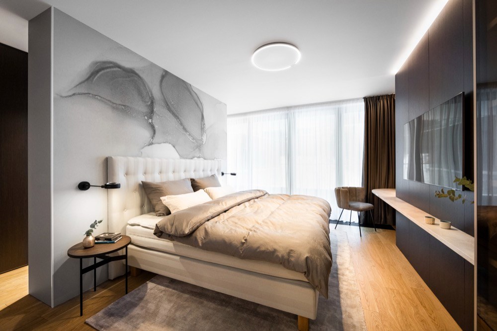 Ložnice, obývací pokoj a chodba Schmalenbach v provedení dýha kouřový dub a primeboard sand grey mezi sebou vedou přívětivý dialog i přes to, že nejsou v bezprostředním kontaktu. Ostatní zařízení v bytě bylo také vybíráno v souladu s celkovým designem interiéru. Ložnici pak dominuje solitérní křeslo Gaia z dílny KFF Design. To bylo navrženo ve spolupráci s designérkou Monicou Armani. Dále byli osloveni prémioví dodavatelé jako Leolux nebo Saffron. V celém bytě můžeme spatřit zrcadla značky Lugi. Ta mají za cíl podtrhnout konečný design a také opticky zvětšit a změkčit prostor.