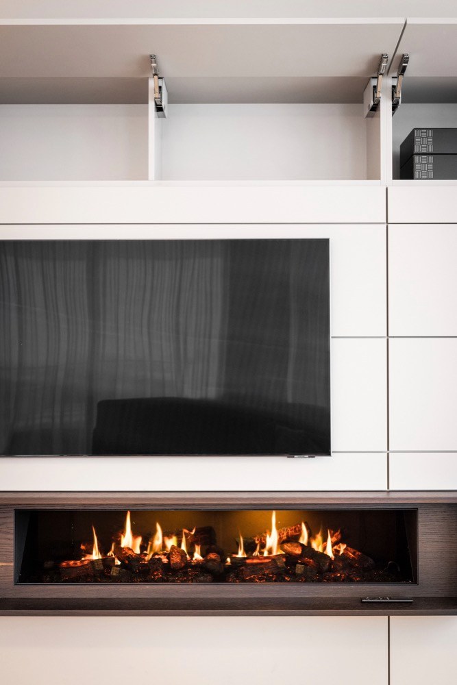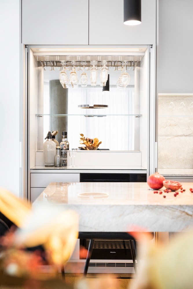 V celkovém návrhu byl kladen důraz na kvalitní materiály a ověřené značky jako Poggenpohl či Schmalenbach Design. Kuchyň Poggenpohl je v provedení matný lak Pebble Grey s kvarcitovou deskou Taj Mahal. „Moc mě těší, že mohu navrhovat pod značkou Poggenpohl, což jsou jedny z nejlepších kuchyní s bohatou historií a renomovaným jménem ve světě. To, co vzniká pod mýma rukama, jsou kuchyně, interiéry vysoké kvality z materiálů, které odolávají zubu času, jsou elegantní a nadčasové,“ říká k realizaci designérka Silvia Hlavová. Zajímavým prvkem v kuchyni je bar, který je součástí kuchyňské sestavy, a to formou tak zvaných pocket doors. Bar je tak schován za dveřmi, které se otvírají do zabudovaných kapes, a není vidět, pokud majitel nechce. Efektivní záležitost, která bude bavit každého, kdo si rád užívá chvilky se sklenkou v ruce, ale zároveň si nepřeje mít nikde v prostoru vyskládané lahve s alkoholem.
