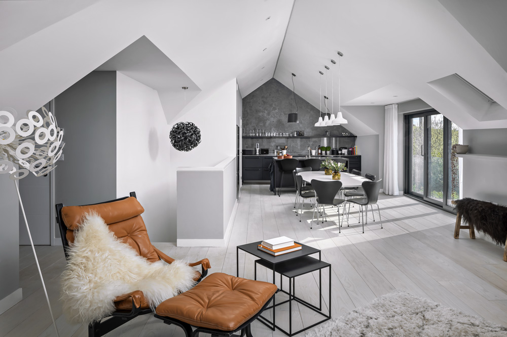 Jsme zvyklí, že v přízemí domu bývají obvykle místnosti, které užívá celá rodina a které slouží k setkávání, a na horní podlaží jsou situovány soukromé pokoje. V případě víkendového domu Mesmire je to přesně naopak. Nepředpokládá totiž běžný všední provoz, ale vše se tu přizpůsobuje tomu, jak co nejefektivněji zajistit a prožít relaxaci. Dům je navíc zasazen ve svahu a horní patro je vstupní. Tady se také nachází hlavní obytný prostor, kterému vévodí na jedné straně modulární kovová kuchyň od dánské značky Vipp s ostrůvkem rozšířeným o snídaňový pult a velkorysý oválný jídelní stůl pro osm lidí.