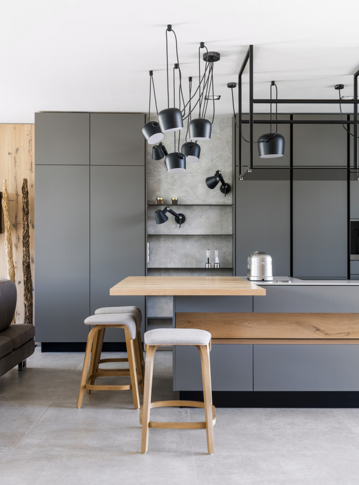 Styl nábytku je jednoduchý a upozorňuje na sebe jen zajímavými detaily. Výrazným estetickým prvkem, který se prolíná celým interiérem, jsou tmavé kontury, které dělí plochy nábytku. Nábytek je z větší části vyroben z matného vysokotlakého laminátu, který je nejen pohledově atraktivní, ale i praktický. Povrch v módním sametově matovém provedení se totiž snadno udržuje a neulpívají na něm otisky prstů. Proto jej návrhář použil v celém bytě i u kuchyňské sestavy. Tu tvoří ostrůvek a vysoký nábytkový mo dul s úložnými prostory a vestavnými spotřebiči. Jednolitost plochy s uzavřenými skříňkami opticky oživuje část s otevřenými policemi.