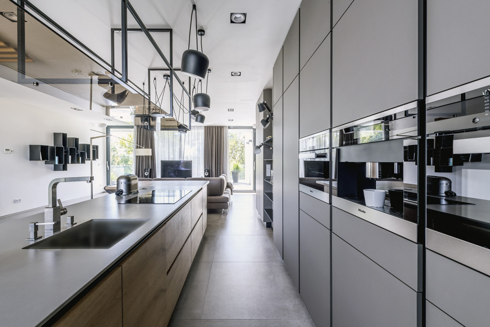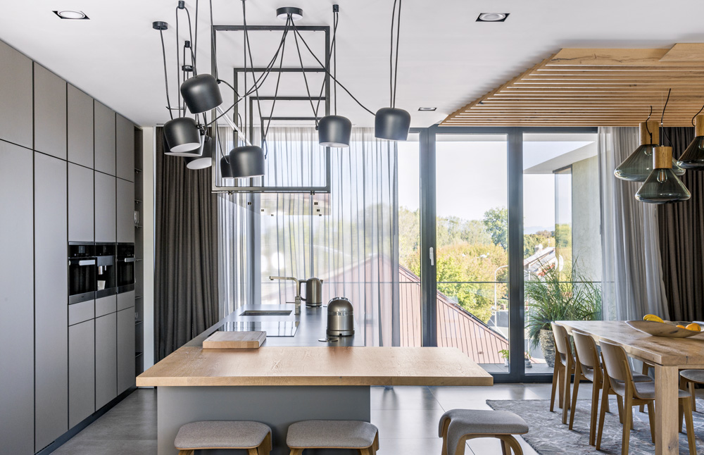 Pracovní plocha, varná deska a dřez jsou situované na prostorném kuchyňském ostrůvku, jehož jedna část je na konci deskou rozšířená tak, aby mohla sloužit jako alternativa jídelního stolu. Zatímco pracovní plochu tvoří tenká keramická deska, část určená ke stolování je opticky zdůrazněná deskou ze světlého masivu.