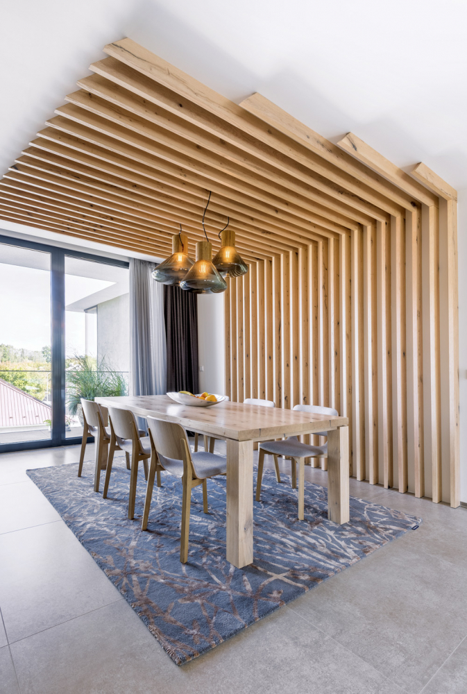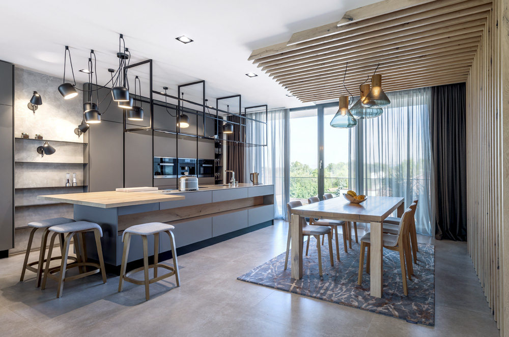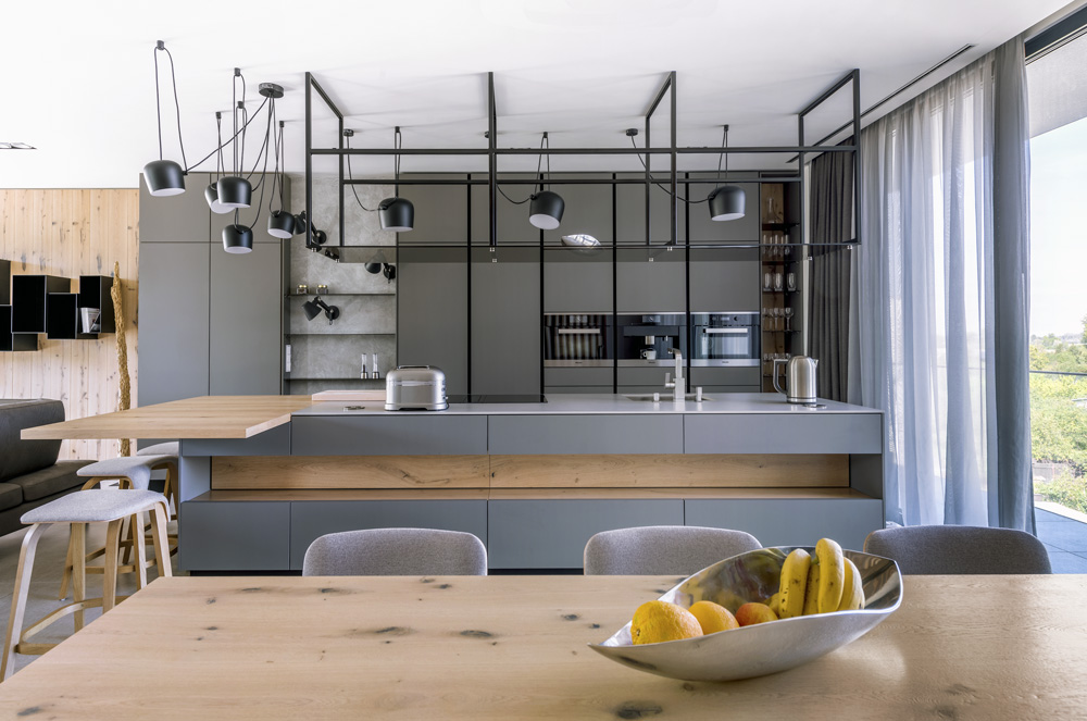 Dekor dřeva ve stejném odstínu se pak opakuje u jídelního stolu a na konstrukci lemující část stěny. Tímto nezvyklým prvkem návrhář opticky vyčlenil jídelní kout. Další nevšední dominantou kuchyně je konstrukce umístěná nad ostrůvkem. Na jejím spodním rámu je kouřové sklo, které tu vytváří nenápadnou polici. Další police je v podobě prosvětlené niky zapuštěná v čelní straně ostrůvku. Osvětlení pracovní plochy zajišťují závěsné lampy, které jsou zdánlivě nahodile umístěné nad ostrůvkem.