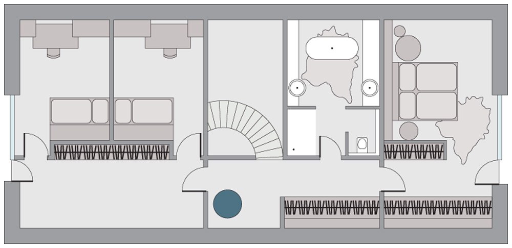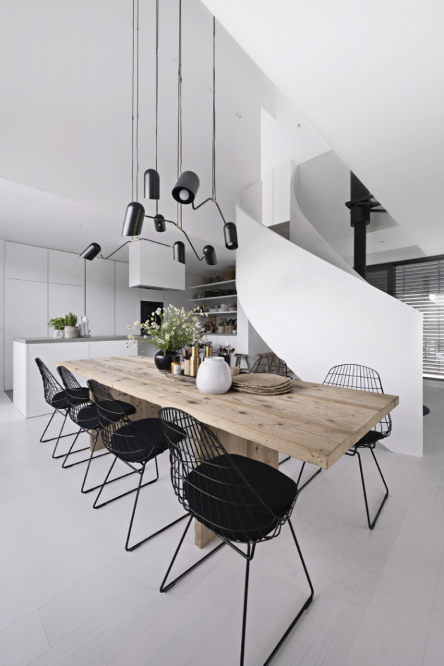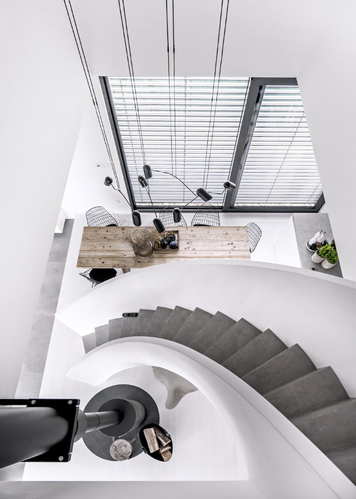 Působí světlým, zcela neutrálním dojmem a díky velkým oknům ho okolní příroda zdobí proměnlivými obrazy. Srdcem stavení je spirálovité schodiště, které padá jako stuha z lávky otevřené galerie. V patře jsou dětské pokoje prakticky odděleny od ložnice rodičů a koupelny. Tímto řešením nabídl architekt uživatelům nejen zajímavý efekt a atraktivitu prostředí, ale všem i vyšší komfort a maximální soukromí.