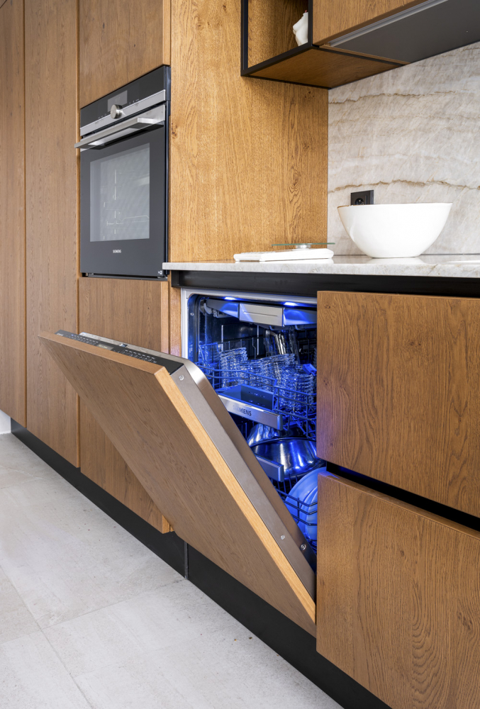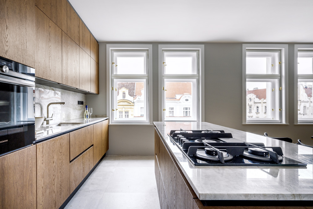 Na povrch nábytku společně s návrhářkou vybrali dřevěnou dýhu, která svým nadčasovým odstínem ladí s klasickým stylem zrekonstruovaného obydlí. Podtrhuje jej i pracovní deska a obložení stěny ze světlé žuly. Moderní podobu propůjčily nábytku tmavé linky, které člení vysoký nábytkový modul s vestavnými spotřebiči, bezúchytkové řešení skříněk, varná deska s robustními plynovými hořáky i policový díl, který atypicky vyčnívá z ostrůvku směrem k jídelnímu stolu.