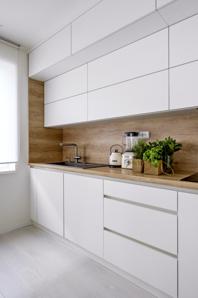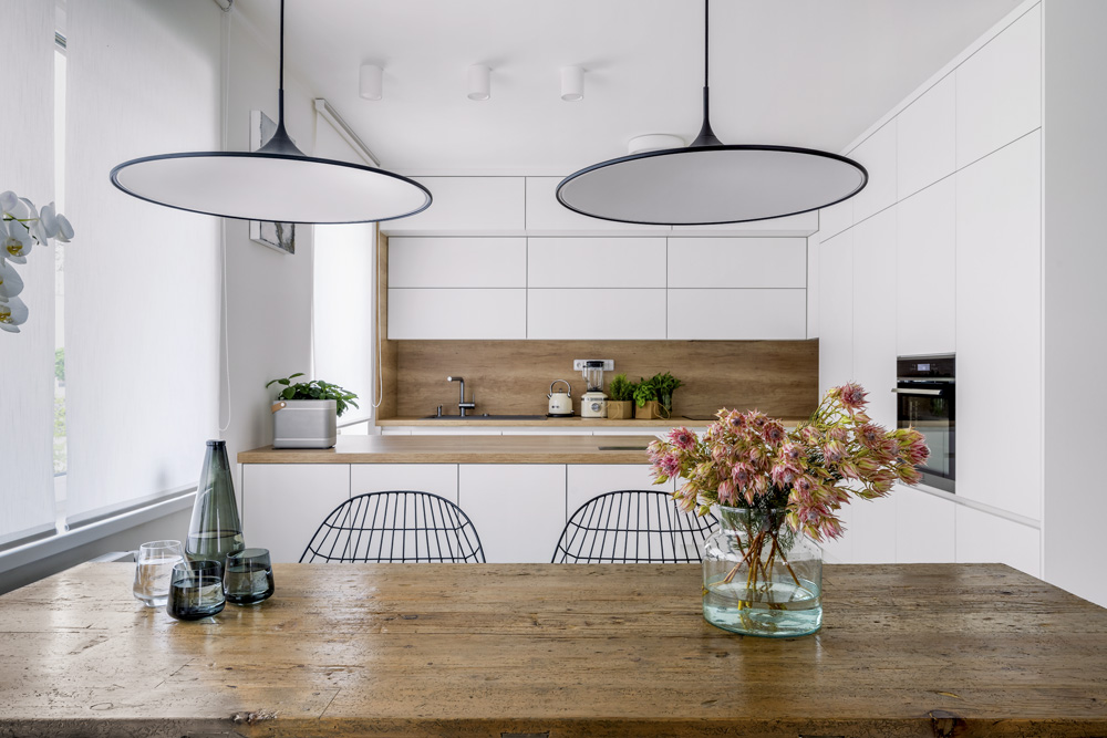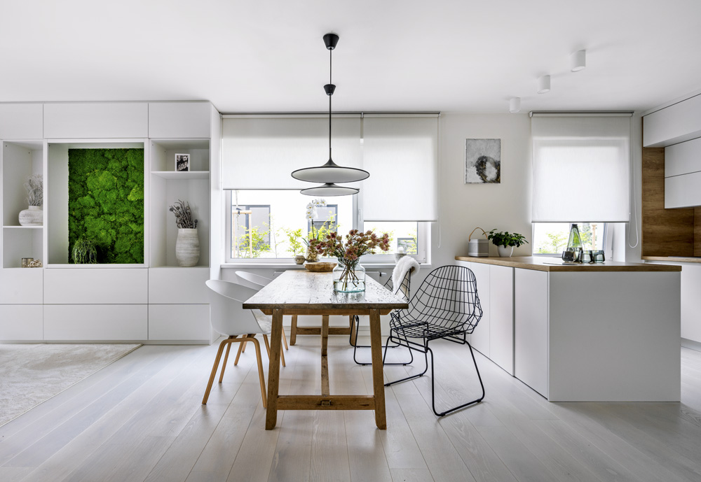 Zvětšila kuchyň a našlo se tu místo také pro magnetickou tabuli. Řešení dispozic kuchyně i polyfunkčního prostoru viděla ihned. „Byla jsem ze zakázky nadšená také proto, že majitelé byli pozitivně naladěni, nakloněni tomuto barevnému konceptu, měli odvahu a souhlasili i s bíle voskovanou dubovou podlahou,“ chválí přístup majitelů.