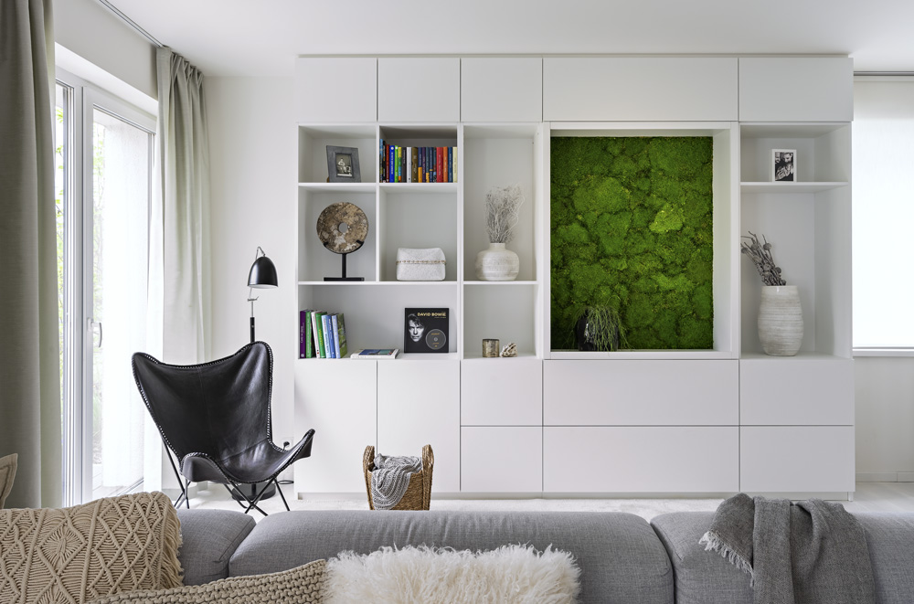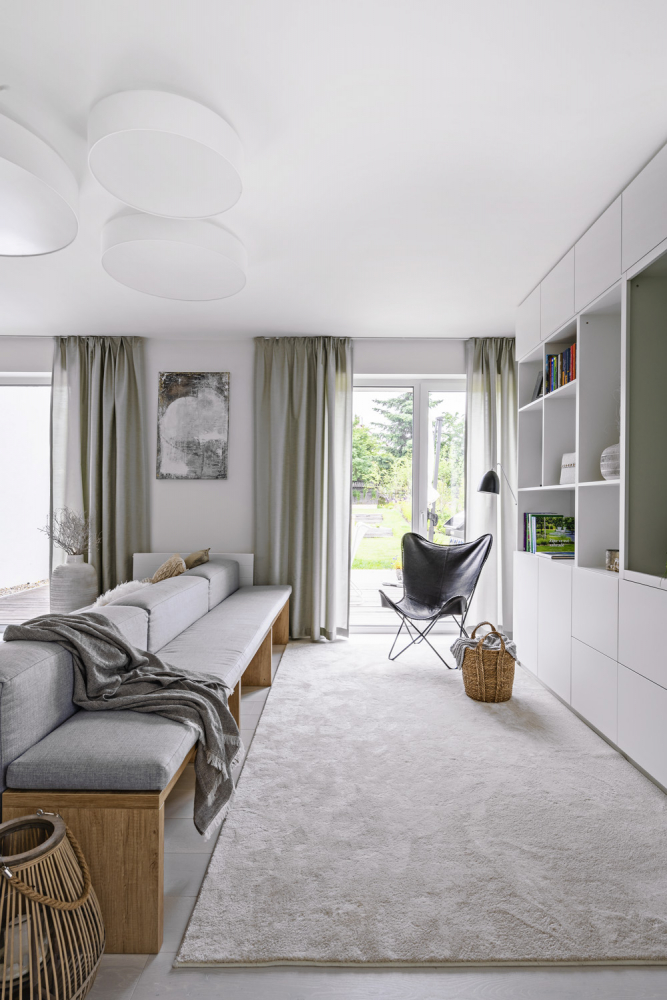 Designérka toužebně očekávaný domov vystihla naprosto skvěle! Příroda se tu hlásí o slovo v mnoha elegantních detailech, aniž by v interiéru vyvolávala dojem chalupy. Přestože tu není krb, je zde vyskládané dřevo, pohled na mechový obraz evokuje pohled do zelené koruny stromu... Designérka velmi zajímavě uchopila i dispoziční členění prostoru. Vznikla tu čtecí zóna s výhledem do zahrady, prostor na hraní pro dceru, relaxační prostor, nechybí ani knihovna...