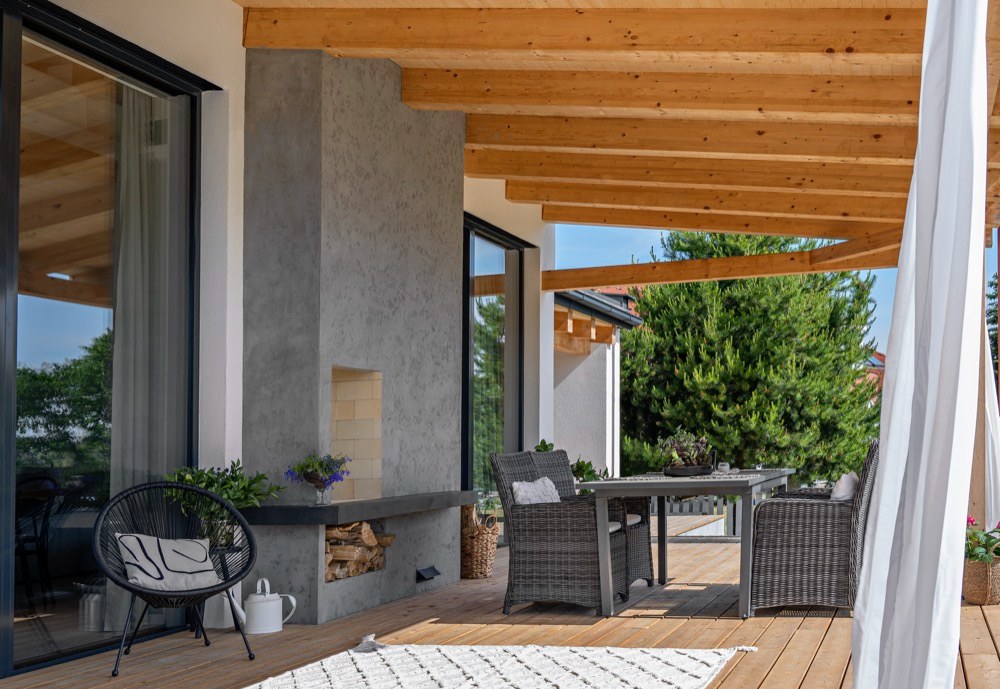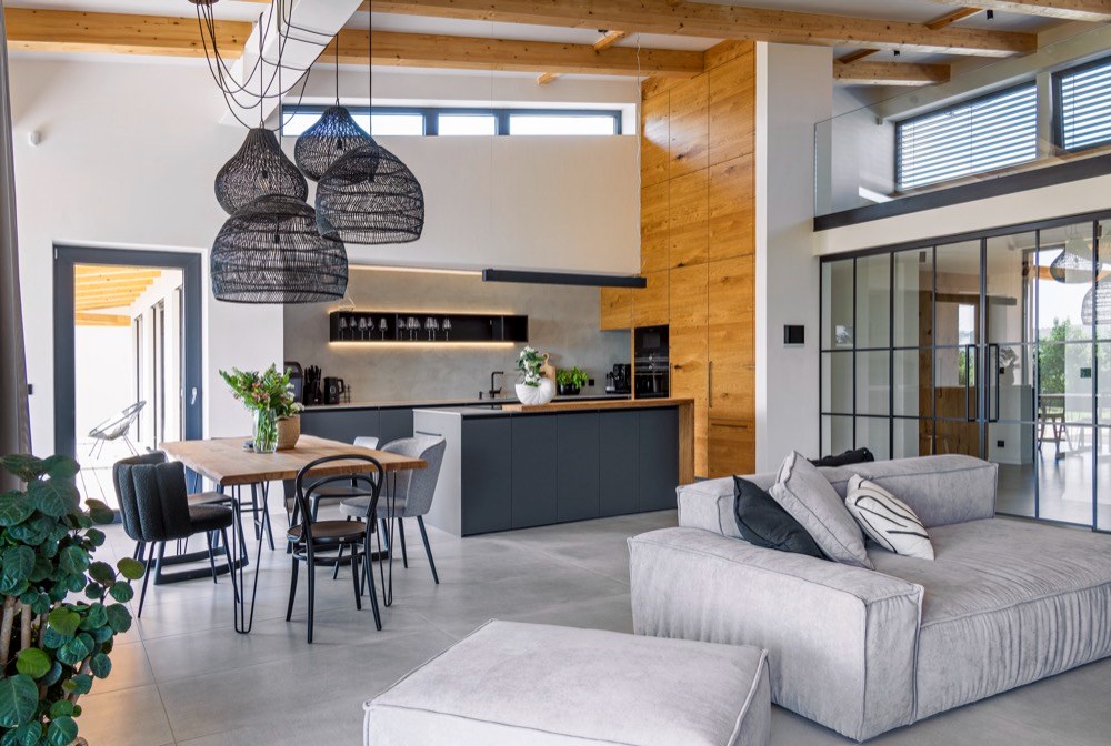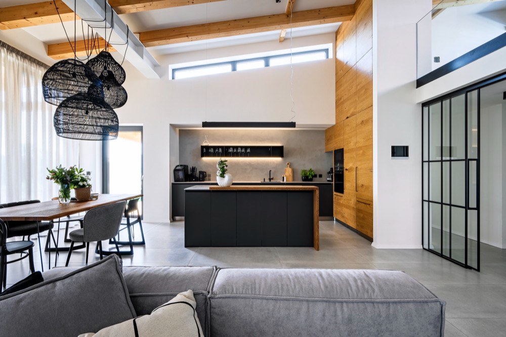 Samotná stavba domu zasazená do mírně svažitého pozemku nebyla nijak snadná. Aby se docílilo efektu otevřeného prostoru s přiznanými trámy stropu nad hlavním obytným prostorem s kuchyní, který má nad sebou otevřenou galerii s pracovnou, potýkala se se složitějšími stavebními detaily. Při zrodu domu byl kladen důraz na jeho praktičnost, nadčasovost a udržitelnost. „Požadavkem byl interiér moderní, ale ne trendový, který se za pár let omrzí. Snad ve všech realizacích se držím pravidla použití neutrálních barev a využití přírodních materiálů, které umějí stárnout a budou pěkné i za mnoho let. To platilo také u této realizace. Sami klienti mají dobrý vkus, nebylo těžké se shodnout,“ vysvětluje architektka. V domě je hodně přiznaných konstrukcí a jsou tu různě provázané výšky stropů.