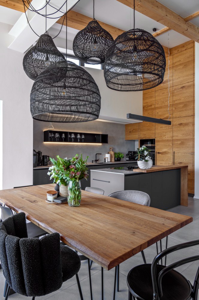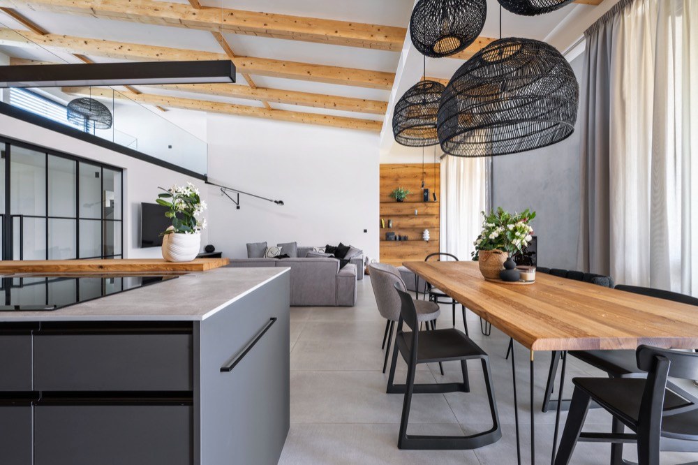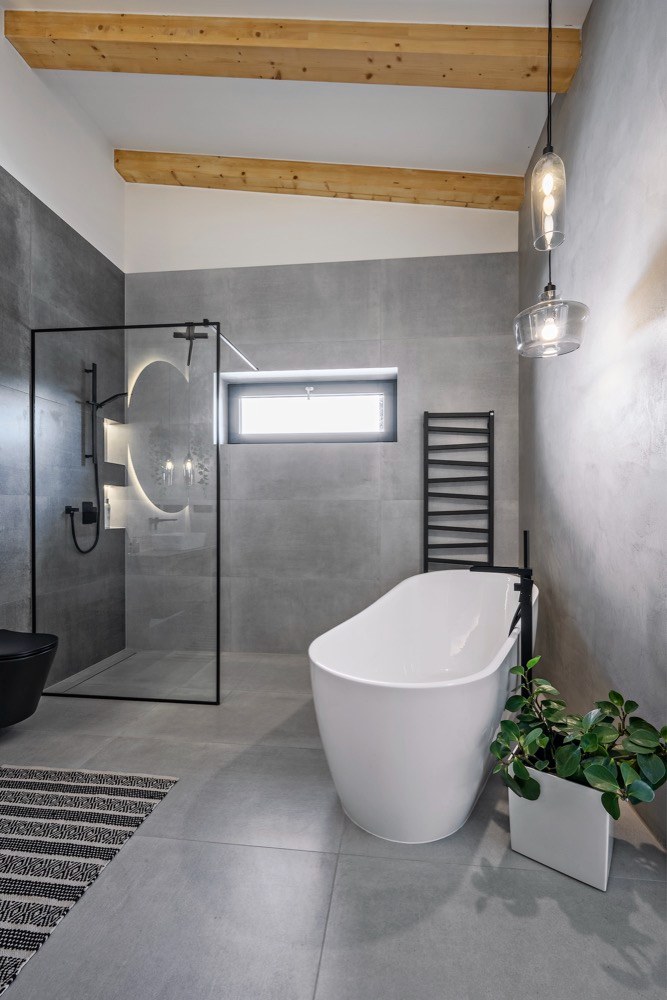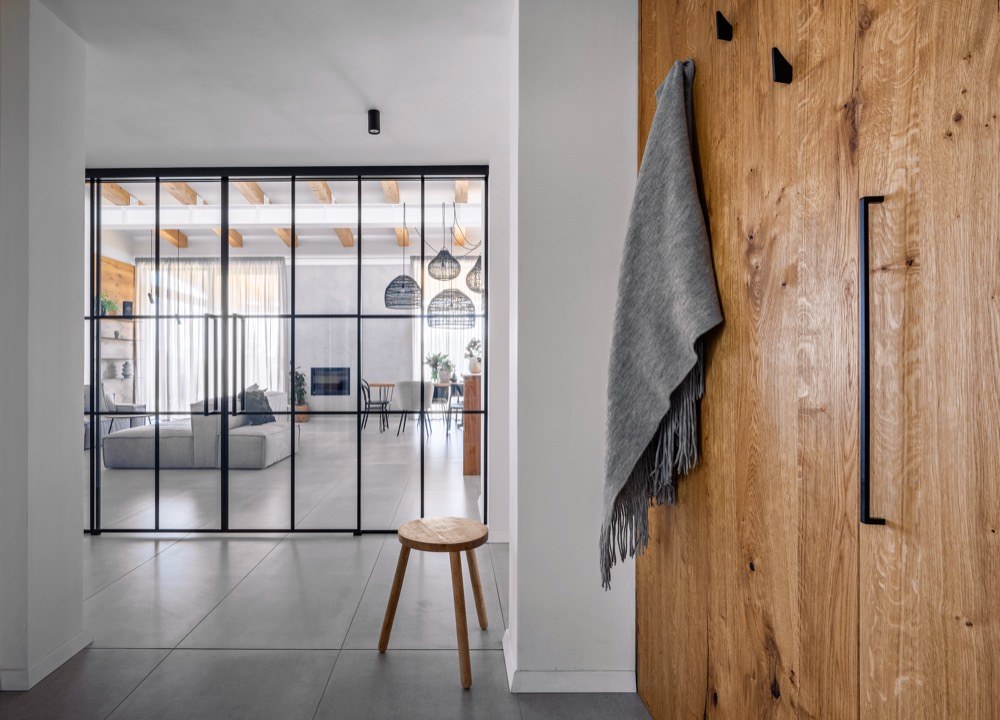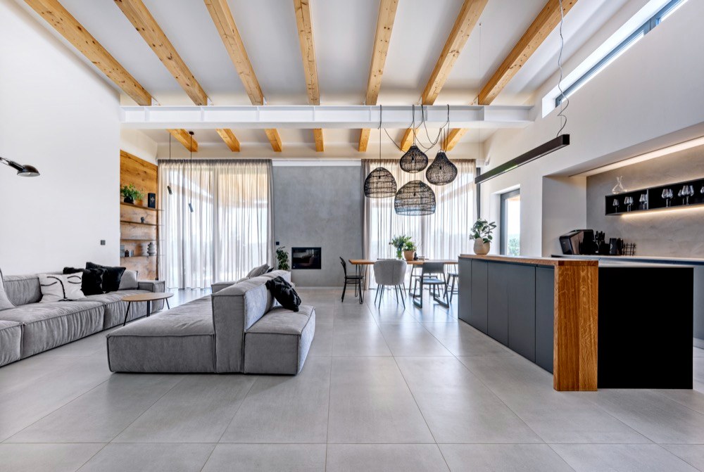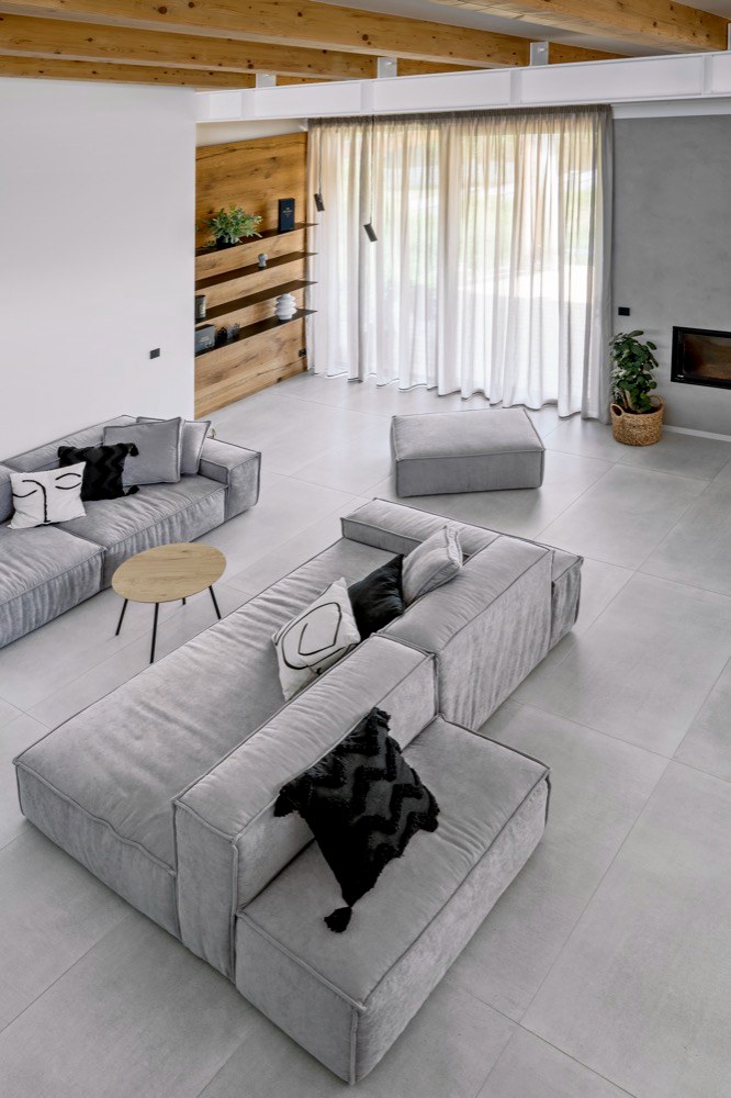 Majitelé si přáli položit dlažbu téměř po celém domě s výjimkou dětských pokojů. Volba samotné krytiny určila i navazující použití materiálů a povrchů na stěnách a nábytku. Dlažbu v dekoru betonu tak na zvolených kusech nábytku doplňuje přírodní dýha. A když už dýha, tak netříděná, aby bylo cítit, že jde o přírodní dřevo, které si dobře rozumí se stropními trámy ošetřenými stejným olejem. Dominantou prostoru jsou i skleněné prvky, kterým bylo věnováno hodně pozornosti v detailech provedení, například v kotvení horního zábradlí tak, aby byl výsledek co nejčistší, ale i praktický pro úklid. „S majiteli jsme se jednohlasně shodli na černých detailech jak kotvicích prvků, tak i dělení velké prosklené příčky s dveřmi mezi chodbou a hlavním prostorem. Bez dělení by ostatně příčka byla i nebezpečná, čistě čiré sklo by některé z návštěv jistojistě způsobilo rozbitý nos,“ komentuje vývoj událostí při zrodu interiéru architektka Pánková.