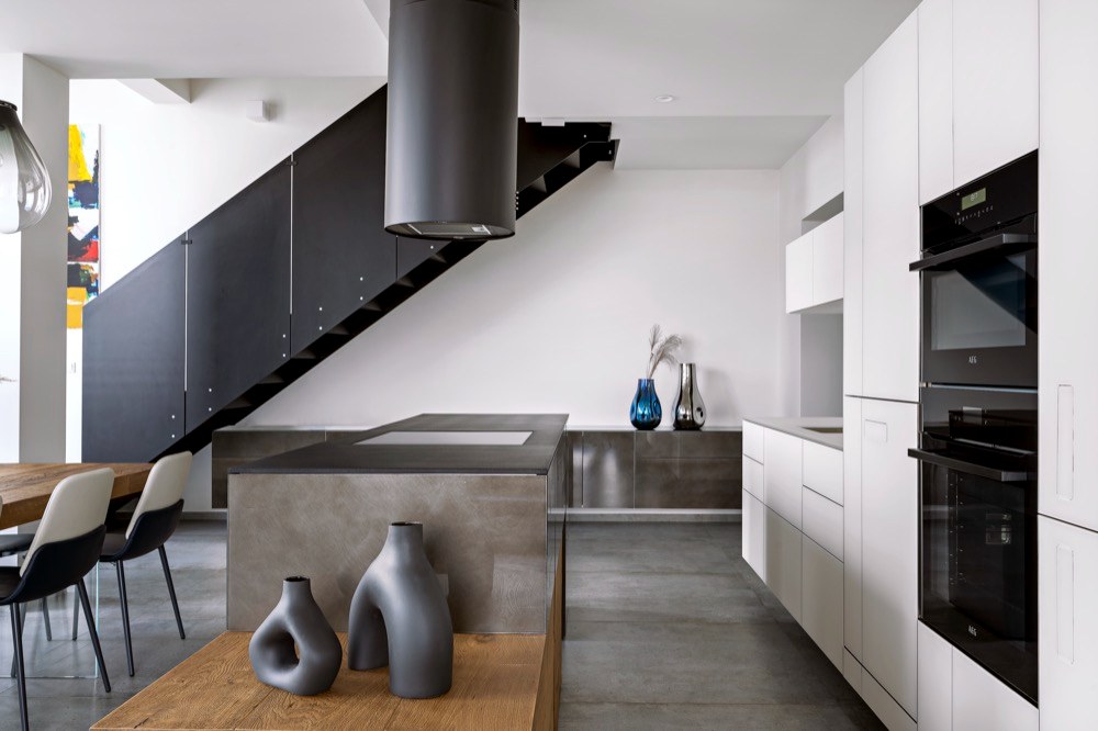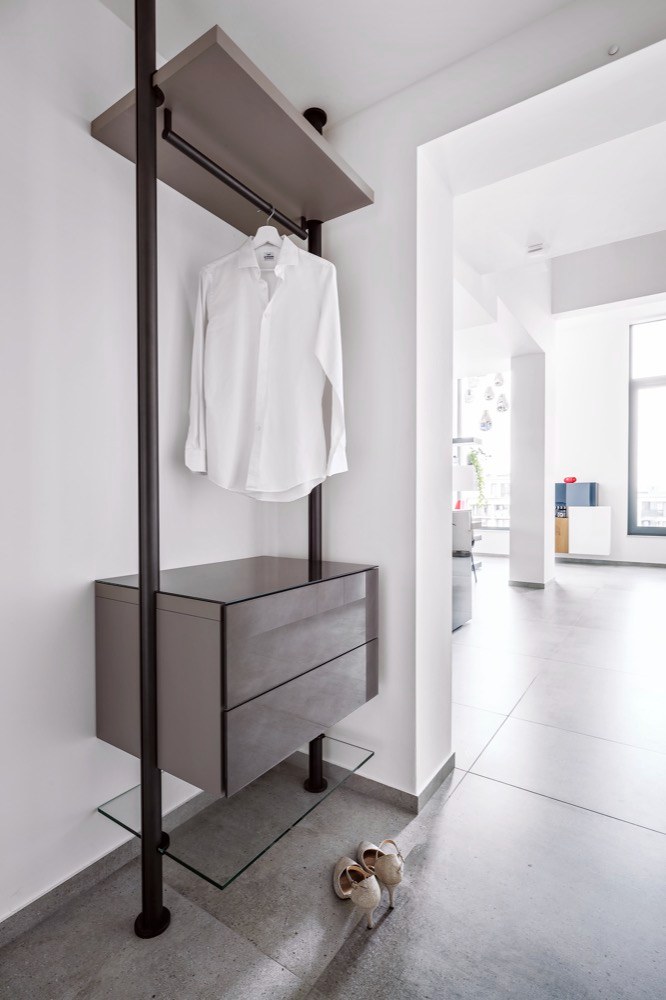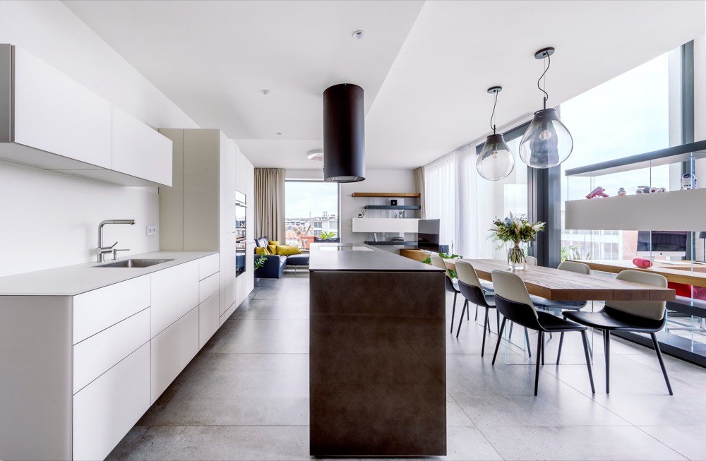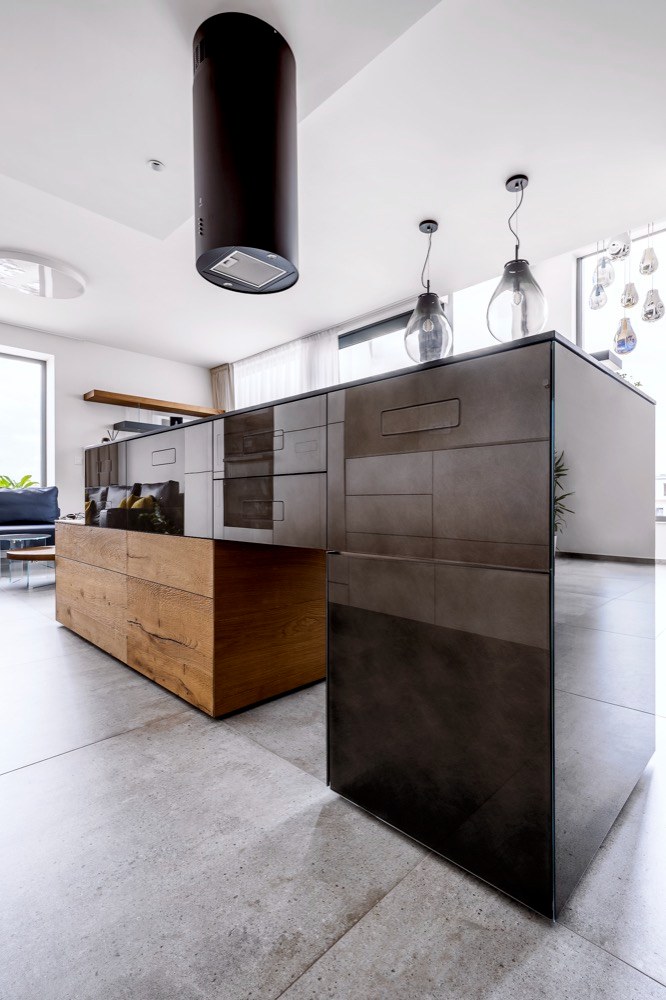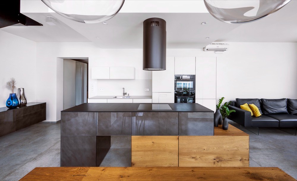 Zásadní pro nás byl dostatek úložných prostor, vizuální jednoduchost a pocitová vzdušnost. Do hlavního obytného prostoru jsme potřebovali umístit velkorysou kuchyň, obývací pokoj, jídelní část i oddělenou pracovnu. Ustoupit jsme museli jen z některých maličkostí... Například jsem chtěl, aby dřez i varná deska byly součástí kuchyňského ostrůvku, a naproti u stěny tak mohly stát jen vysoké kuchyňské skříně. Dřez ale nebylo možné do ostrůvku dostat, protože už když jsem jednotku přebíral, bylo v ní podlahové vytápění zalité betonem, kvůli čemuž nebylo možné vést podlahou odpad.