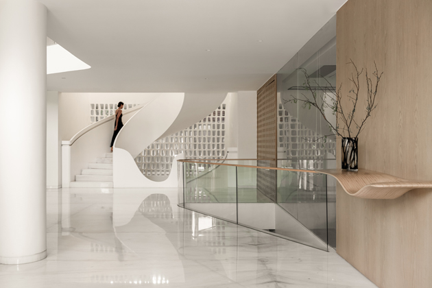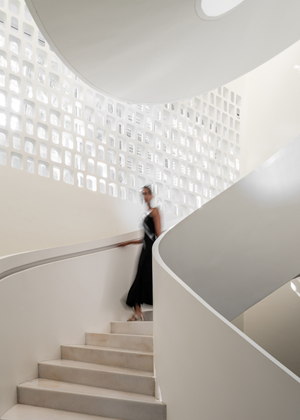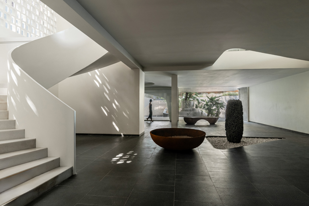 Světlo a udržitelnost hrají v návrhu zásadní roli. Budova je orientována tak, aby do interiéru pronikalo co nejvíce denního světla, což snižuje potřebu umělého osvětlení a vytváří přirozenou dynamiku stínů. Pasivní prvky, jako vodní plochy a stíněné terasy, pomáhají s ochlazováním prostoru a minimalizují přehřívání v extrémně horkém klimatu. Interiér je navržen tak, aby byl energeticky efektivní – využívá přirozenou ventilaci, recyklaci vody a materiály s nízkou ekologickou stopou. Tento přístup ukazuje, že udržitelnost může být součástí luxusního bydlení, nikoliv jeho omezením.