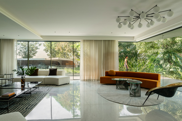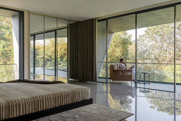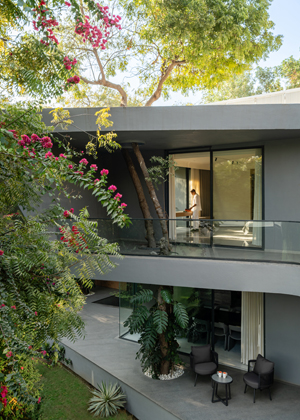 Projekt Nine X Nine v indickém Gandhinagaru je rezidence, která propojuje moderní bydlení s okolní přírodou a reaguje na místní klima s vysokými teplotami. Dům je zasazen mezi stávající stromy a jeho dispozice respektuje okolní prostředí – zahrada je dominantní součástí návrhu a všechny obytné místnosti jsou orientovány tak, aby na ni navazovaly. Minimalistická architektura pracuje s čistými tvary a neutrální barevností, což zdůrazňuje světlo a zeleň jako hlavní estetické prvky.