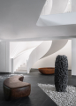 Interiér je pojatý velmi střídmě a s důrazem na přírodní materiály. Dominantní je bílý mramor, který prostor opticky otevírá a odráží denní světlo, takže místnosti působí vzdušně a svěže. Dřevěné prvky – nábytek i obklady – dodávají interiéru teplo a zabraňují tomu, aby působil chladně nebo sterilně. Barevná paleta je neutrální, s jemnými akcenty, které podporují klidnou atmosféru. Nábytek má jednoduché tvary a je vybrán tak, aby byl funkční i estetický; každý kus má svůj účel a nepůsobí rušivě. Interiér tak nepřipomíná galerii designu, ale pohodlný a praktický prostor pro každodenní život.