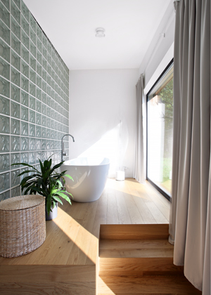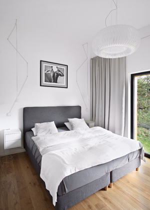 Interiér je laděný do světlých tónů, stěny i všechny vnitřní dveře jsou bílé, což působí velmi čistým dojmem. Útulnost a hřejivost dodává dřevěná dubová podlaha. Celkový dojem pozvedává osvětlení, promyšlené do každého detailu jedním z majitelů domu, jehož povoláním je světelný design. Každému koutu domu i zahrady dodává kýženou atmosféru. Najdeme tu „náladová“ světýlka Easy Peasy v pastelových tónech růžové a modré (Lodes), velké přenosné světlo Dome Nomad (Brokis), které má své místo na podlaze obývacího pokoje, a když majitelé sedí večer v závětří kryté terasy, přenesou si ho tam. Senzitivně osvětlená je i venkovní fasáda. Když mají majitelé hosty nebo si chtějí užít večerní výhled, rozsvítí si bodová světla namířená do korun stromů a velké oranžové svítidlo Mars (LineaLight), které se stalo dominantou jinak divoké travnaté zahrady. Okna i klempířské prvky jsou v černé barvě, což zdařile kontrastuje s jinak světlým interiérem.