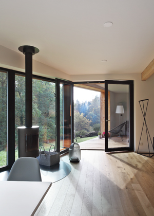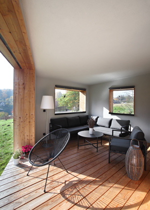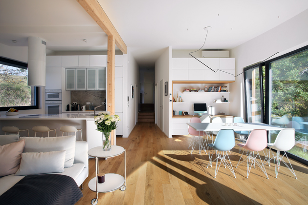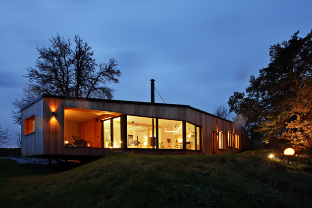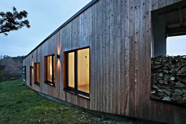 Přízemní dům doslova splynul s okolím a stal se příjemnou součástí přírody, kterou nijak neruší. Kromě šumícího listí v korunách stromů tak lze z domu pozorovat i srnky, které se přicházejí pást až do jeho bezprostřední blízkosti. Dřevostavba stojí na konci malé obce na svažitém pozemku, který přechází na jedné straně v les a na druhé straně v travnatou louku. Terén lesního porostu na okraji pozemku navíc prudce klesá dolů – k blízkému potoku, jehož šum vytváří příjemnou zvukovou kulisu místa. Všechny místnosti domu včetně koupelny disponují směrem k lesu velkými prosklenými plochami a obyvatelům domu umožňují užívat si přírodní atmosféru výhledem do vrchních pater lesa naplno.