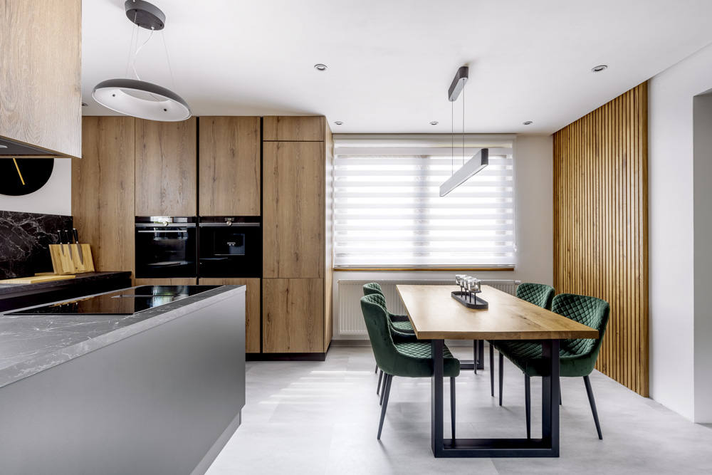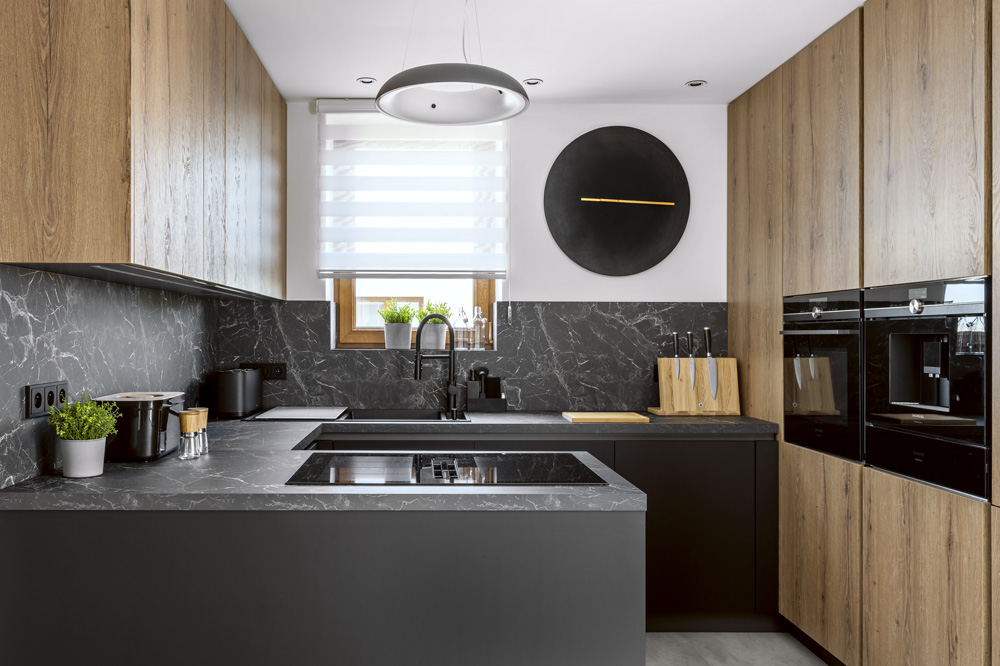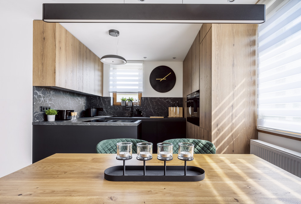 Volbu barevného řešení kuchyně přizpůsobil majitel ostatnímu zařízení, do kterého se promítá jeho sympatie k dubovému dřevu. S ohledem na to vybrali ve studiu na nábytek lamino s věrohodným dekorem dubu a zkombinovali jej s černým povrchem materiálu Fenix s nanotechnologií, jenž koresponduje s kovovými prvky použitými u stolů v jídelně a v obývací části. Díky tomuto jednoduchému barevnému řešení působí celek moderně a stylově čistě.