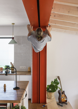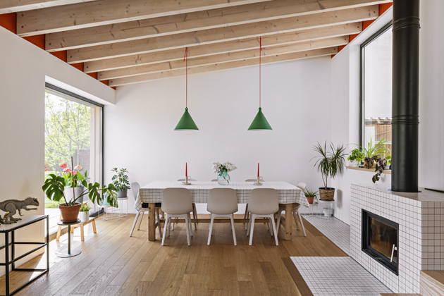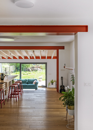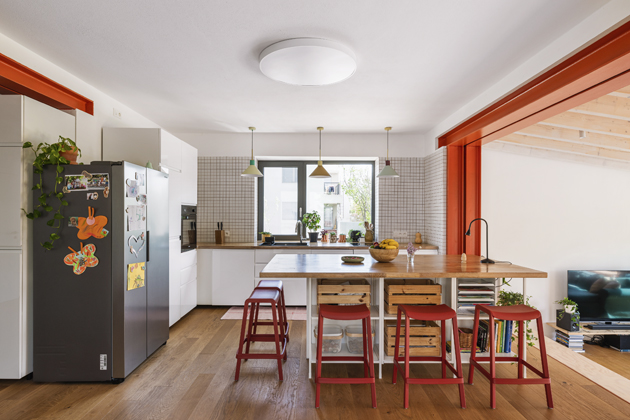 Prostor samotné kuchyně je hravě zarámovaný červeně lakovanými ocelovými překlady, jejichž barevnost se odráží na dalších detailech, jako jsou barevné židle nebo červené spárování drobných čtvercových obkladů. Zbytek kuchyně zůstává bílý, aby nechal vyniknout přirozenou krásu dřeva i jemnou hru barevných doplňků. Zdrojem kuchyňského zařízení je ve většině případů IKEA.