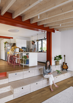 Rekonstrukce se ujal mladý slovenský ateliér benkobenkova, který soustředil pozornost zejména na parter s kuchyní, jídelnou a obývacím pokojem, potažmo i se zahradou. Tedy na prostor, kde tráví rodina nejvíce času pospolu. Zásadním krokem bylo vytvoření jednoduché přístavby, s níž se obývací pokoj přiblížil k terénu zahrady a otevřel se možnosti propojení s prostornou venkovní terasou. Výškový rozdíl mezi ním a kuchyní architekti přetavili ve výhodu vytvořením „schodolehára“, multifunkčně využitelných schodů, které poslouží k posezení, poležení i ukládání věcí. Ve spojení s krbovými kamny velepříjemný prostor jako stvořený k zimnímu lenošení.