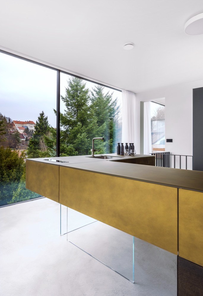 Celý hlavní obytný prostor ve 3. patře o celkové ploše 160 m2 je od podlahy do stropu obklopen sklem a skutečně ho člení pouze jediná příčka na denní a noční část. Toto dispoziční řešení navozuje optimistickou atmosféru, kterou není možné zažít mezi čtyřmi stěnami s malými okny. Prostoru dominuje velký stůl, u kterého se odehrává nejdůležitější společenská událost rodinného života, kterou je společná příprava a konzumace jídla.