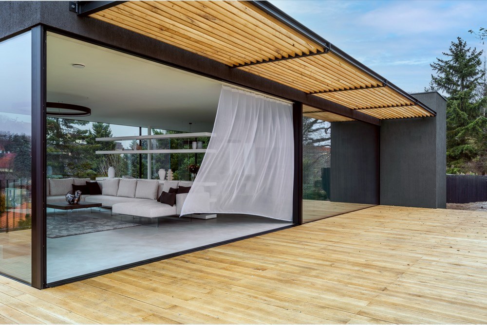 V žádném případě. Díky ideální konfiguraci pozemku nám „do talíře“ nikdo ze sousedů vidět nebude a hlavně – prosklená fasáda poskytuje ve srovnání s tlustou stěnou mnoho fantastických předností. Plná stěna s malými okny nemůže nabídnout úchvatné panoramatické výhledy a záplavu denního světla. Dalším benefitem je obrovské šest metrů široké posuvné okno. Když ho otevřeme, odstraníme vlastně kus stěny mezi vnitřkem a terasou, a obytný prostor tak rozšíříme o dalších 100 metrů čtverečních.