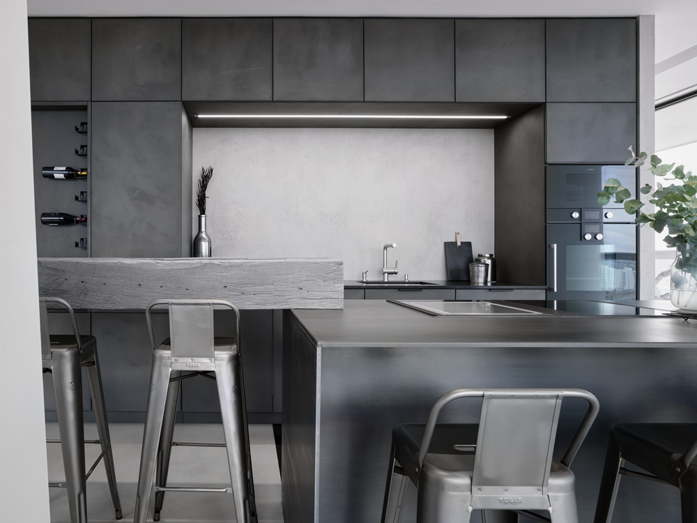 Tento materiál, získaný ze staré stodoly, byl dovezený z Rakouska a následně ještě speciálně ostařený. Na ostrůvek a další kusy nábytku použily návrhářky surovou ocel, kterou v dalších částech interiéru pocitově zatepluje sametové polstrování sedací soupravy. Povrch kuchyňského nábytku tvoří dekor tmavé betonové stěrky.