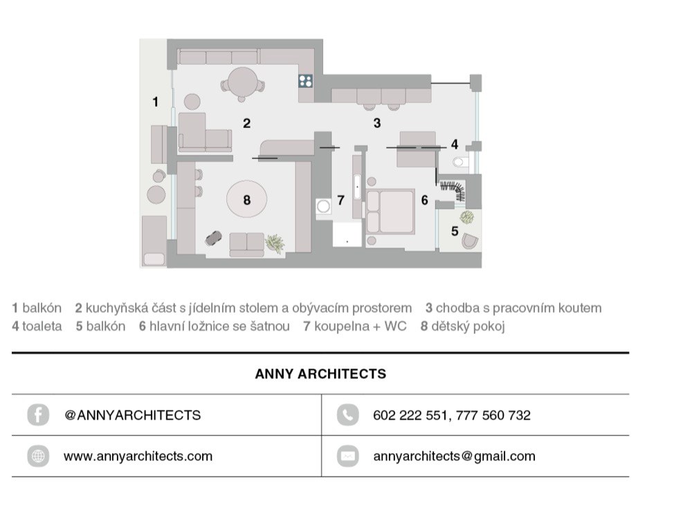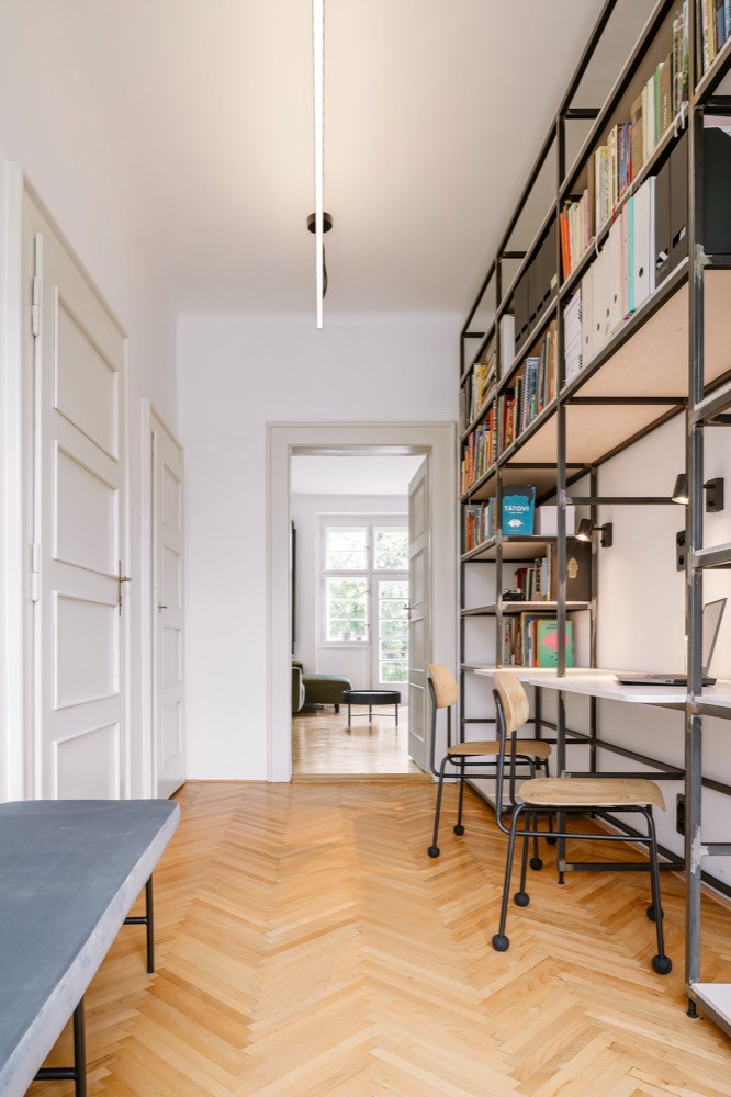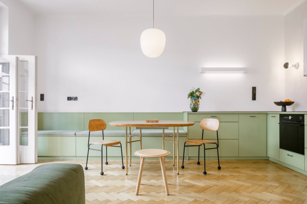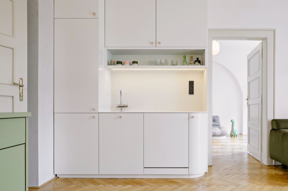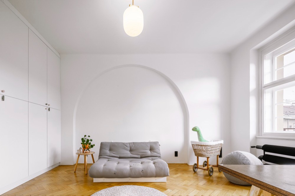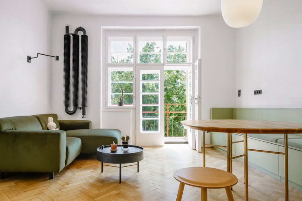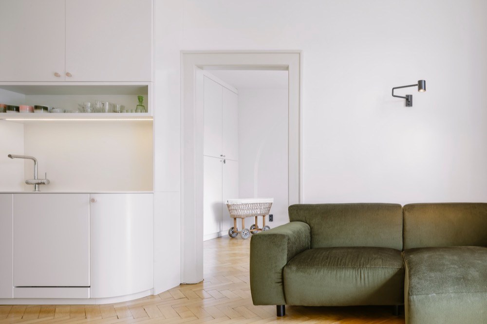 Byt pro mladou rodinu se nachází ve vršovickém bloku domů postavených před sto lety architektem Františkem Albertem Librou v puristickém stylu, které byly vyhlášeny kulturní památkou. Majitelé oslovili architektky ze studia ANNY architects, aby s respektem k minulosti naplnily jejich současné potřeby.