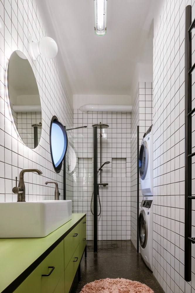 Lomená zelená v kombinaci s pudrově růžovou tvoří základní barevné schéma, které doplňují materiály jako MDF lakovaná lomenou bílou nebo zavoskovaná černá ocel. Lomená zelená prostupuje celým bytem – jedná se o vysokotlaký laminát HPL, známý jako „umakart“. Extrémně odolné HPL lamináty splňují mimořádné požadavky na zatížení a trvanlivost. Vysokotlaké HPL lamináty jsou odolné vůči vlhkosti, vodní páře a chemikáliím. Proto jsou doporučeny pro použití v kuchyních, laboratořích a nemocnicích, ale také jako pracovní pulty a stoly s vysokým zatížením. Vzorkovaly jsme asi pět druhů HPL, než jsme narazily na ten pravý a od toho se vše odvíjelo dál... Tím pádem jsme si mohly dovolit pracovní desku v barvě dvířek.