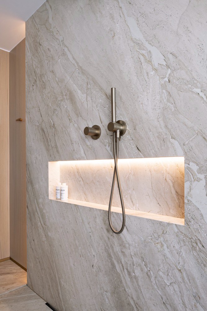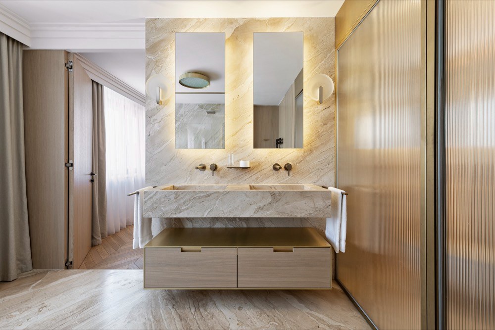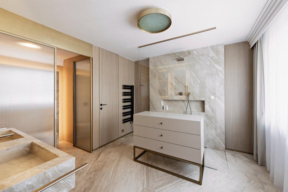 Koupelny, stejně jako zbytek interiéru jsou zařízeny minimalisticky. Jako obklad zde byl použit velkoformátový přírodní mramor ve světlé barvě v kombinaci s bateriemi ze zlatého kartáčovaného kovu. Ten umocňuje luxusní vzhled místnosti, ale nikterak jí neubírá na eleganci. Právě naopak.