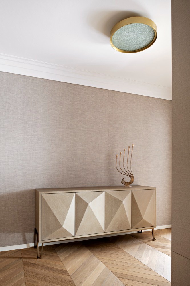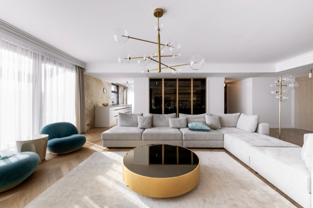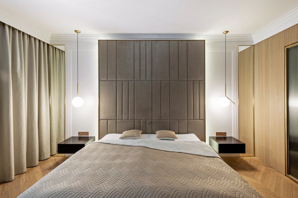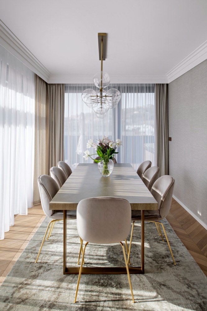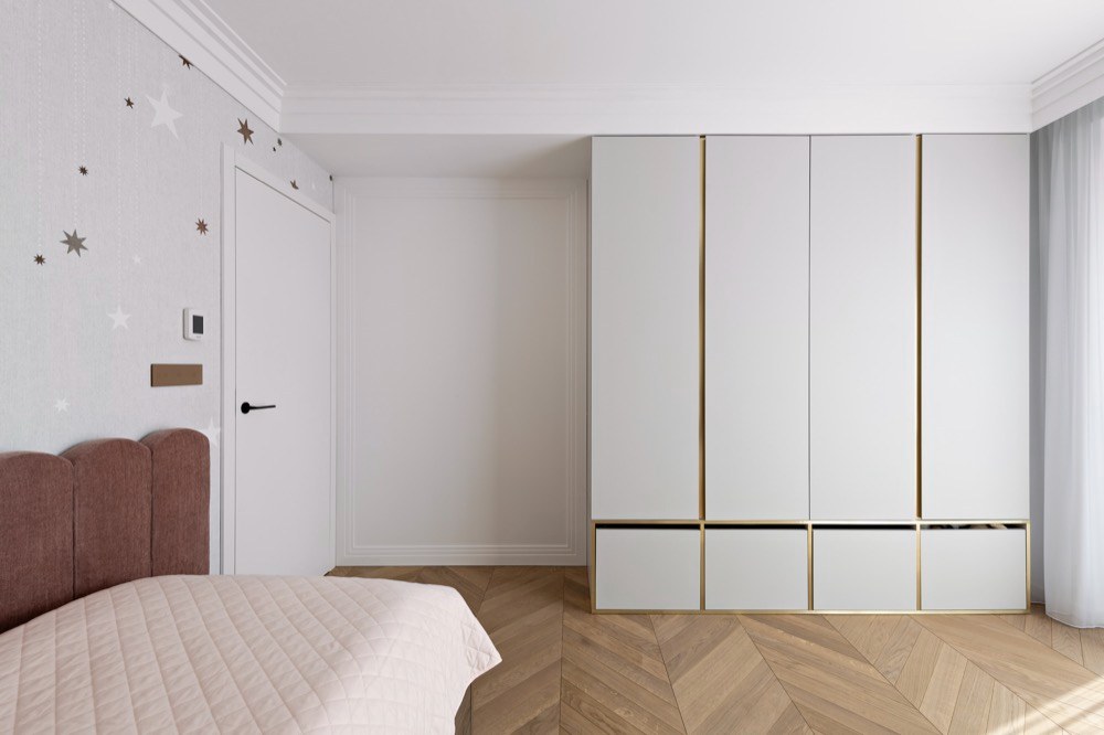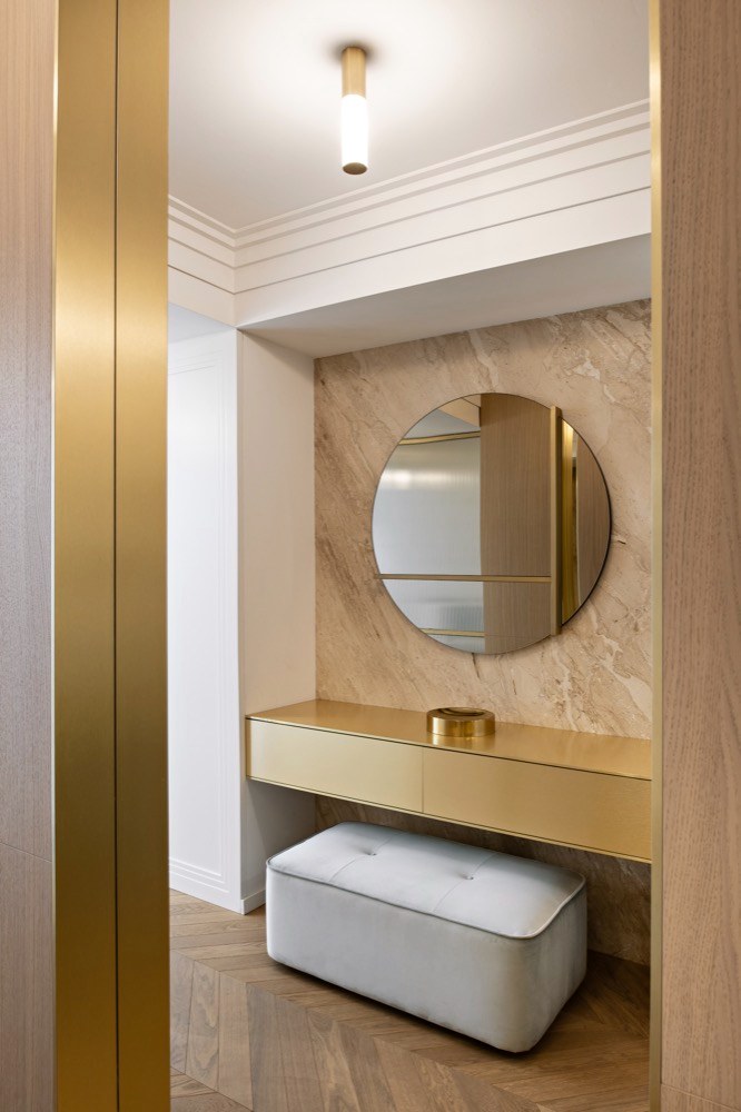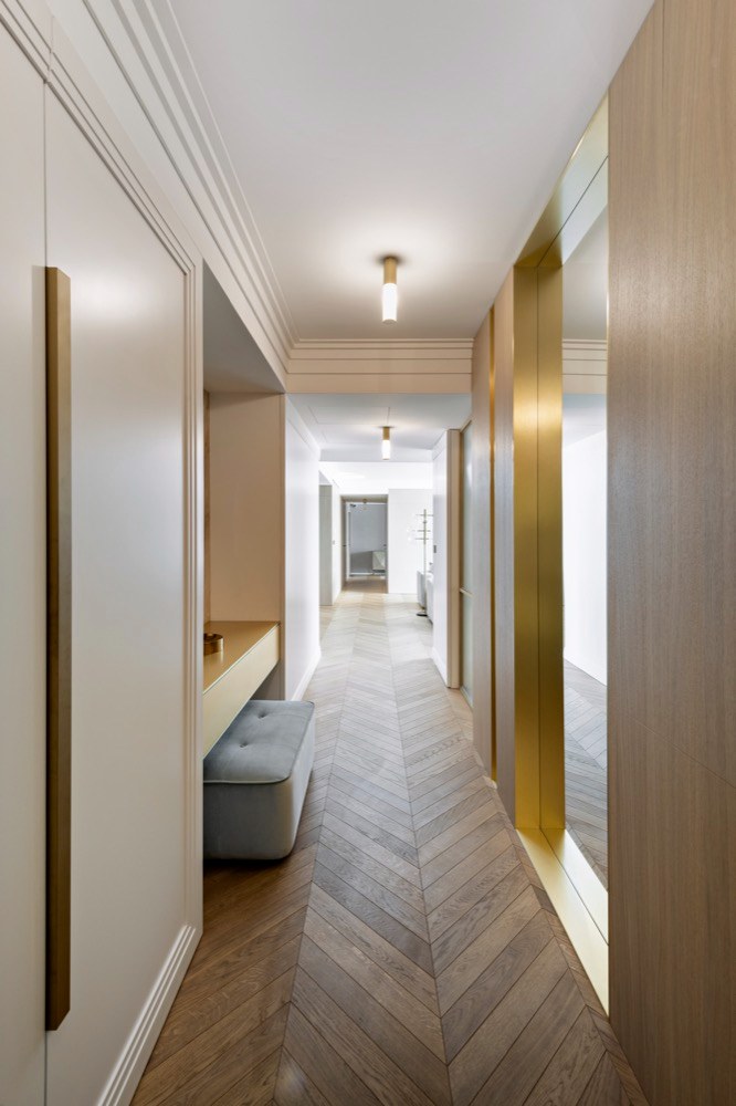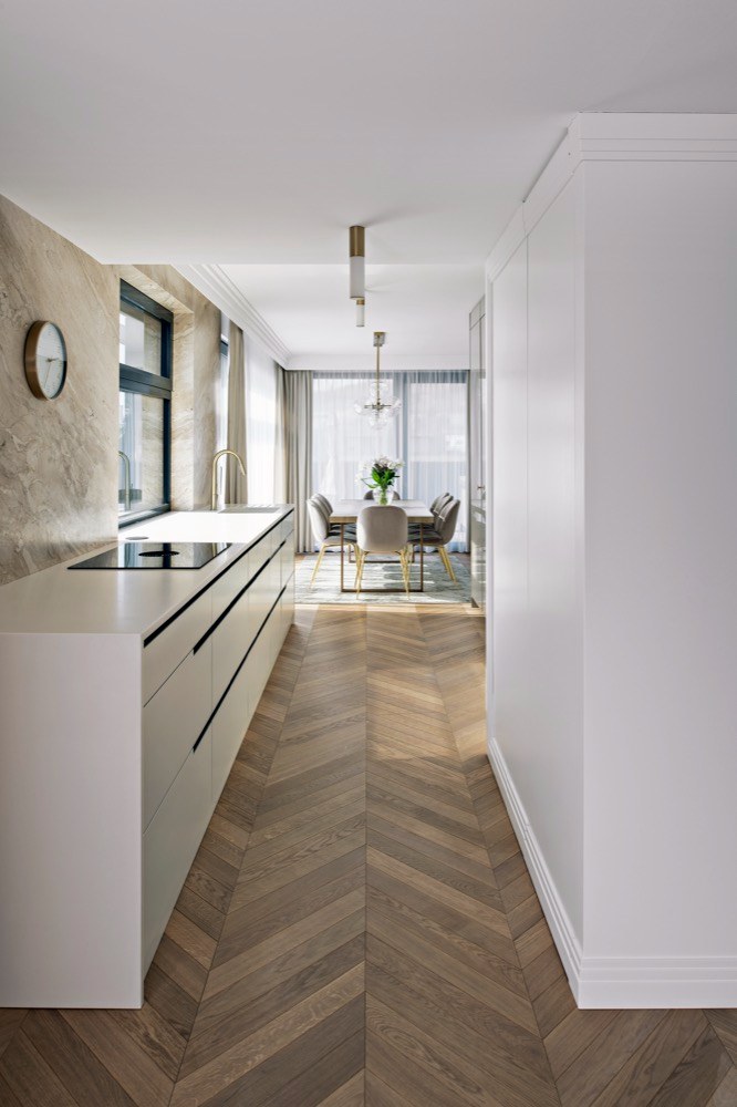 Byt se nachází v samém centru Starého města. Není tedy divu, že tento fakt se odráží i v interiéru. V celém prostoru tak můžeme spatřit podlahu položenou v klasickém chevronu nebo hojné dekorativní prvky v podobě ozdobných lišt na stropě, stěnách či nábytku. Lišty v tomto případě ovšem neslouží jen jako estetický prvek. Mají také svůj funkční smysl. Především jejich umístění na zdech je strategické. Právě díky nim na první pohled není zřejmé, kde všude se v bytě nacházejí úložné prostory.