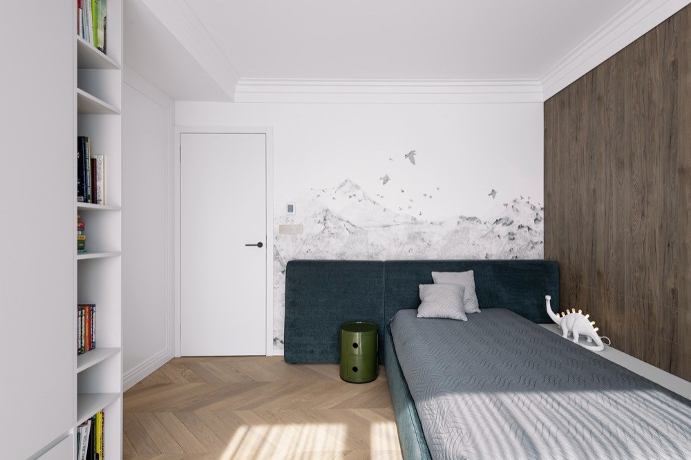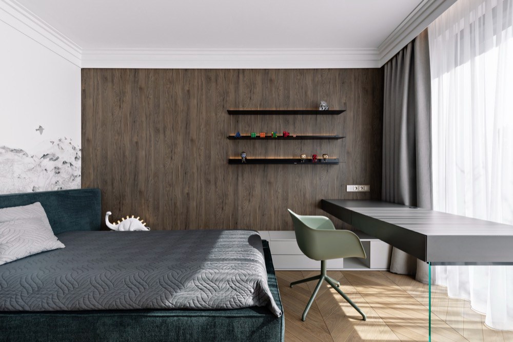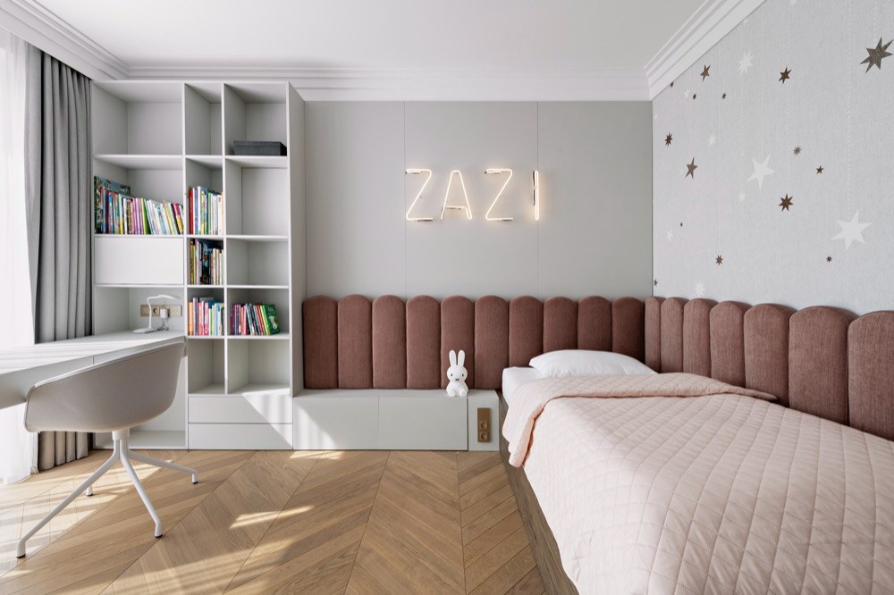 Na první pohled je očividné, že v ložnici si autoři interiéru skutečně dali záležet při navrhování postele. Její čelo vede až ke stropu, což působí velmi originálně. Postel sama o sobě je tam dominantou celé místnosti, která je ve zbytku jednoduše a minimalisticky zařízená. Dětem, děvčeti a chlapci, pak náleží každému samostatný dětský pokoj. Oba pokoje jsou opět zařízeny vkusně a decentně. V dívčím pokoji převládají odstíny růžové a cihlové, v chlapeckém potom modré a petrolejové.