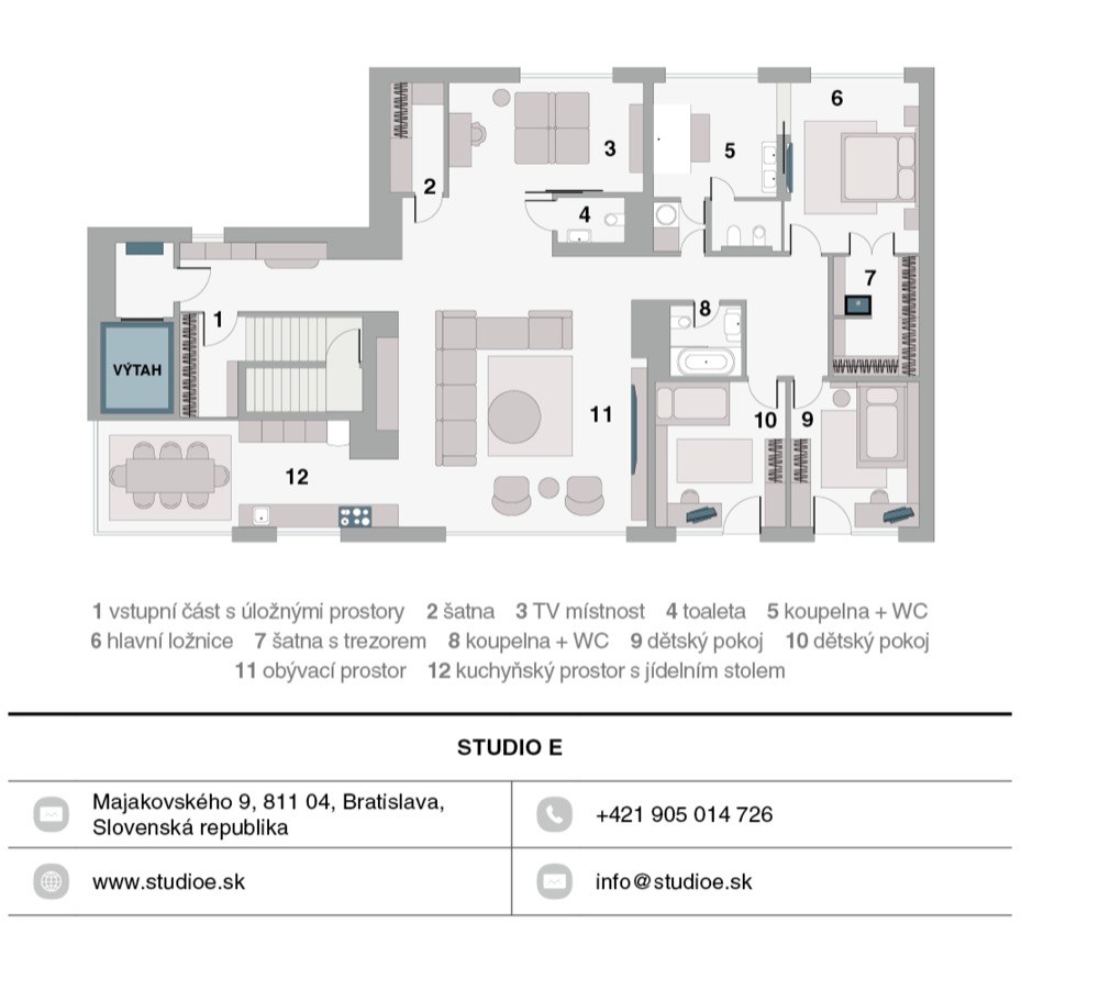 Studio e založil jeho současný kreativní ředitel Erik Pastucha, který je nejen vizionář, ale také profesionál ve svém oboru. Jeho interiérové návrhy udávají trend, a to nejen na domácí půdě, ale také v zahraničí. Na Slovensku mělo studio možnost podílet se na realizaci interiérů i pro řadu celebrit, například pro herečku Zuzanu Fialovou, zpěvačku Máriu Čírovou nebo hokejisty Mikko Koskinena a Andreje Sekeru. Erikův tým dnes tvoří celkem pětadvacet členů. Ti všichni spolupracují s jasným cílem nenavrhovat interiéry, ale tvořit domovy. Na této konkrétní realizaci se podíleli architekti Ing. arch. Erik Pastucha, kreativní ředitel studia, který zastřešil návrh projektu, a Ing. arch. Zuzana Bučková, senior design manažerka, která byla zodpovědná za samotnou realizaci projektu.