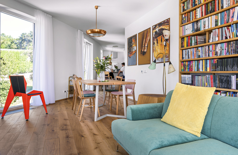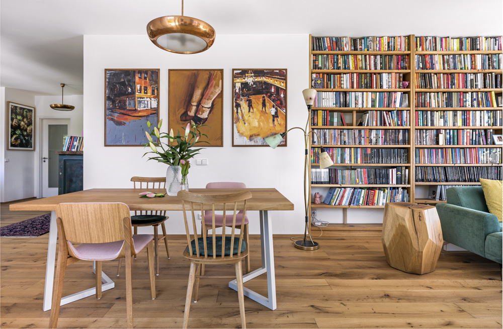 Do barevného konceptu skvěle zapadá i velká knihovna, která rovněž naplnila jejich očekávání a perfektně zaplnila prostor niky atypického prostoru společenské zóny. Vyrobil ji velmi spolehlivý truhlář, pan Kulhánek, který je zároveň autorem jídelního stolu i postele v ložnici.