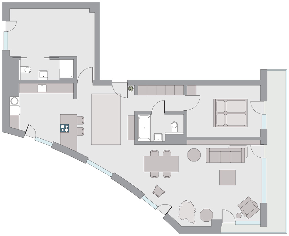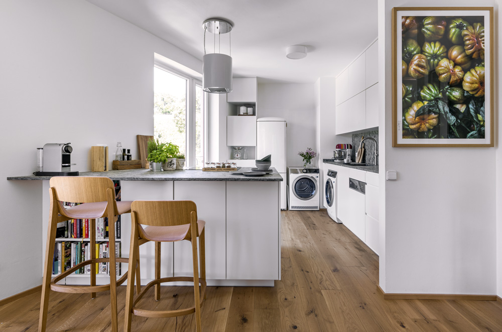 Veronika toužila především po velmi světlém prostoru prozářeném sluncem, velké kuchyni a dostatečném množství úložných prostorů. Tento byt si Lukáš vyhlédl v šest let staré budově, když si hrál se synem na protějším hřišti. Hodně cestuje, proto potřeboval bydlet i v blízkosti nádraží. Ze seznamu plusů a mínusů vyčnívala jen jeho vyšší cena, kterou ale s ohledem na bohatě prosklenou fasádu, velkou lodžii a krásný výhled do zeleně partneři akceptovali.