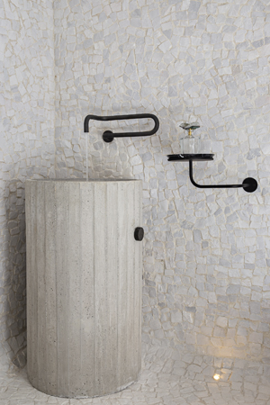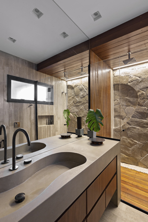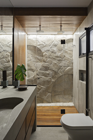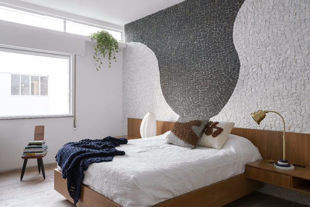 Hlavním úkolem architekta i všech jeho kolegů bylo v rámci tohoto projektu zajistit minimální povrchové úpravy, a to i navzdory nedokonalostem a nepravidelnostem typickým pro brutalistický moderní byt. Dřevěná podlaha je původní, ale byla ošetřena epoxidový nátěrem. Aby ji bylo možné zachránit a začlenit do nové dispozice, bylo nutné ji celou vyjmout a ošetřit. Křivky, které se setkávají s teracovou podlahou, nepůsobí pouze esteticky. K tomu došlo především proto, že v celém společenském prostoru nebyl podlahové krytiny dostatek. V hlavním apartmá byly křivky zakomponovány prostřednictvím panelu provedeného v portugalských kamenech. Tím vzniklo zajímavé spojení s chodníky v Riu navrženými Burle Marxem, jedním z oblíbených umělců majitelů.