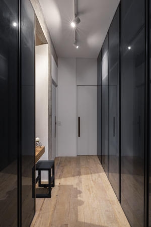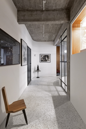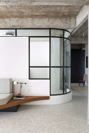 Byt byl sice již ve své původní podobě velmi dobře členěný, ale dispoziční řešení jednotlivých místností nebylo příliš šťastné. A to převedším z důvodu jejich hojného počtu. Architekt Rafael Zalc se tak rozhodl pro radikální řešení, kdy z původního plánu zcela odstranil hostinskou ložnici. Tím docílil toho, že se celý prostor více otevřel, a byt se tak doslova nadechnul do nového života. Hlavní obytný prostor je tak společenská místnost a kuchyň. Ta je sice oddělená posuvnými dveřmi, ale jako by stále byla součástí tohoto velkorysého prostoru. Kromě toho studio navíc změnilo i uspořádání zbylých místností a využití dvou stávajících ložnic. Vytvořili tak v bytě nové prvky, například obloukovou stěnu z kovových konstrukcí a skla. Ta je už sama o sobě dalším pomyslným uměleckým dílem v tomto domově plného umění.