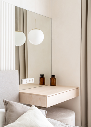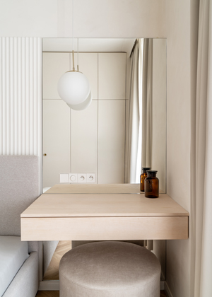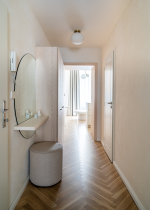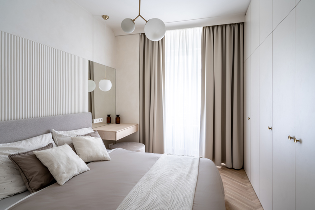 Změna dispozice ale přinesla výrazný benefit i opačnému konci bytu. Nové umístění ložnice směrem do vnitrobloku zajišťuje obyvatelům ničím nerušený spánek, chráněný od ruchu ulice. Atmosféru harmonického prostoru navíc posiluje řešení vestavného úložného systému na míru, a to po celé délce stěny. Místnosti pocitově dodává vzdušnost a designovou čistotu. Minimalisticky je zde řešený i závěsný toaletní stolek se zrcadlem, který se nachází u okna, v těsné blízkosti postele. Profilovaný dekorativní panel za čelem postele pak stejně jako parketový vzor podlahy jemně odkazuje na historický kontext budovy.